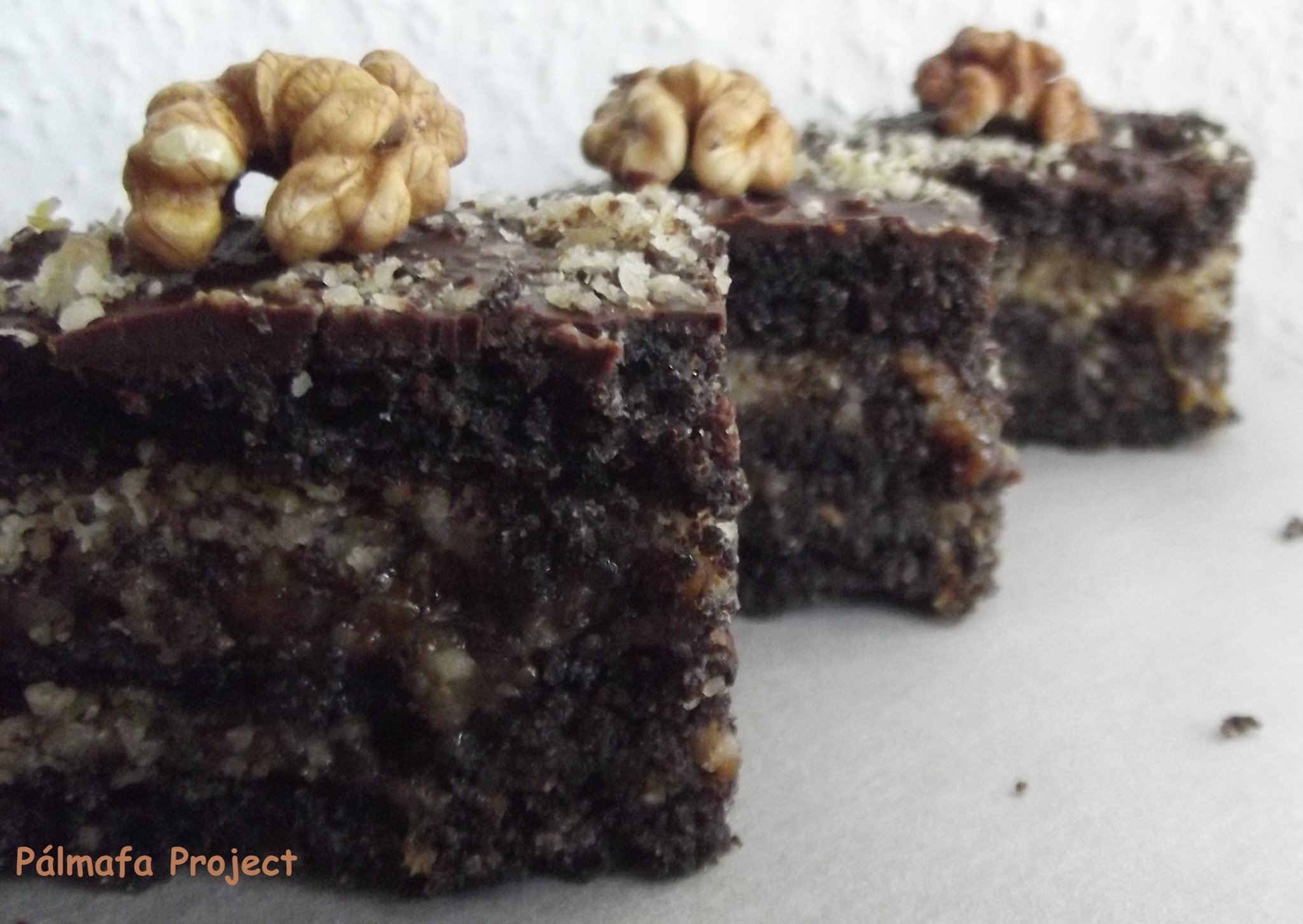 Gluténmentes zserbószerűség….Diós, baracklekváros és csokis is, a tésztája viszont nem gyúrt, cserébe mákos, ezért lóg ki a sorból. A barátnőm rágta a fülem, hogy csináljak valamit ami zserbóra hajaz, de gyúrni és nyújtani nem kell… Haladás ha Ő zserbóra vágyik, hiszen emlékszem, hogy pár éve még áradoztam neki egy másik csokis-diós-lekváros sütiről, majd Ő közölte, hogy csináljak neki is, csak se lekvárt, se diót ne tegyek bele, mert azt nem szereti… Szóval, most viszont várom, hogy elkészítse ezt és megkínáljon belőle! Ez a tesztverzió és mondhatni kiállta a próbát, egyetlen negatívum talán, hogy a tésztája morzsálódik kicsit az elvágásnál, amit négykezes művelettel sikerült kivitelezni, de ez bevállalható a cél érdekében. Ha hűvös helyen picit hagyjuk állni, míg a csoki megdermed és az egész süti életre kel, akkor egész szépen szeletelhető. Liszt és cukormentes, pontosabban nyírfacukrot használtam az édesítéséhez. Kivéve a lekvárt…részletkérdés annyi belefér…az a fontos, hogy minden ízében karácsonyi édesség, nem túl bonyolult elkészíteni, picit hamarabb lehet falatozni, mint a zserbót, hiszen keleszteni sem kell. Legközelebb a mákhoz reszelnék citromhéjat, az kimaradt…bár ez semmit nem von le az ízéből.
