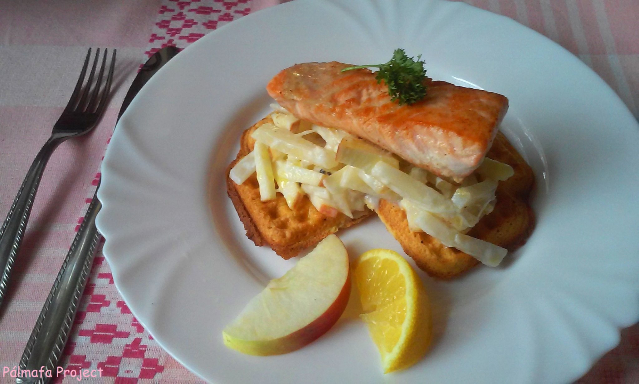 5. Lazac, almás zelleres salátával gofriágyon