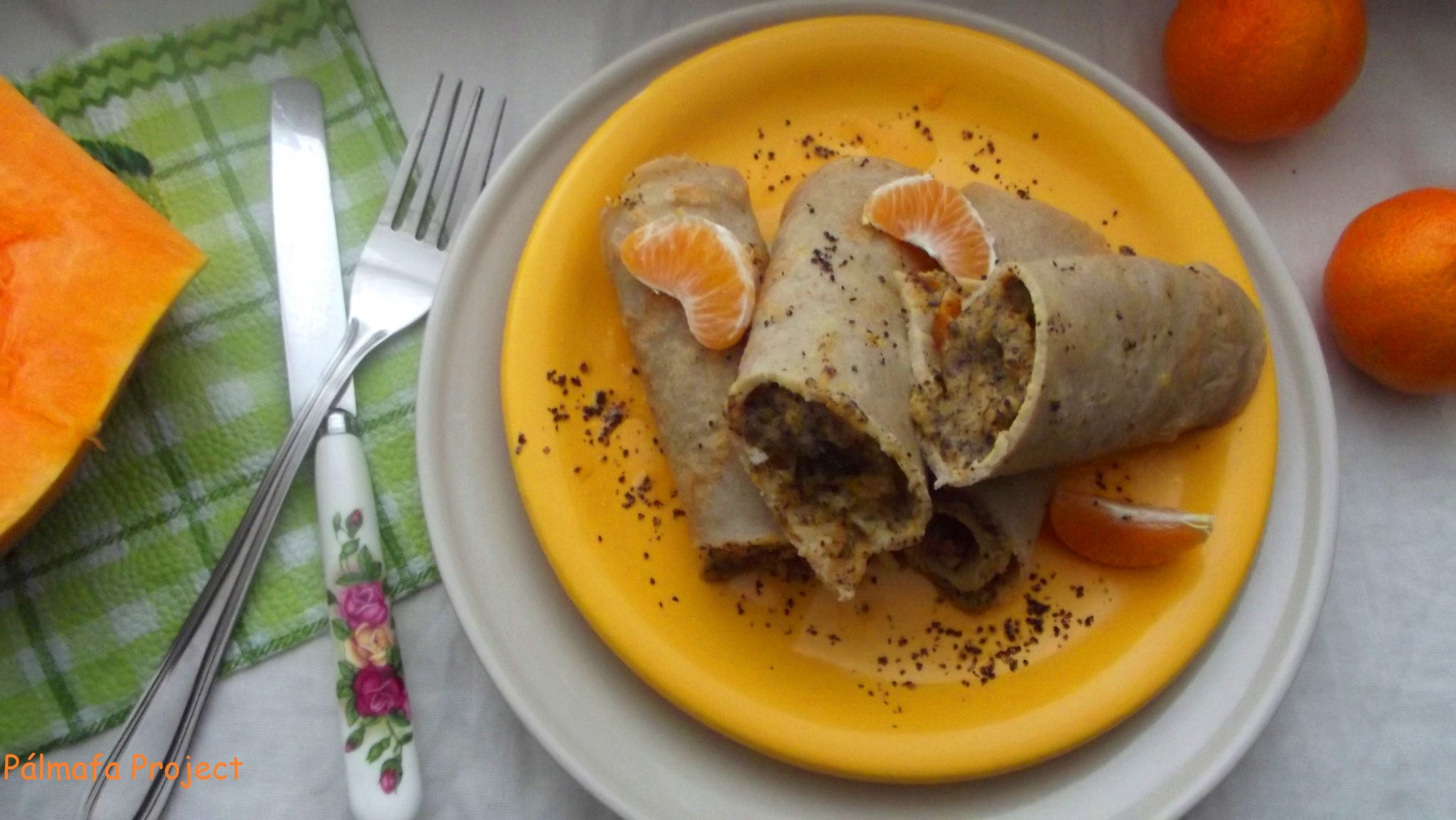 Ezután lehet tölteni és tekerni a palacsintákat, a tetejére pedig én facsartam a mandarin levéből is, illetve pár szelett mandarinnal tálaltam.