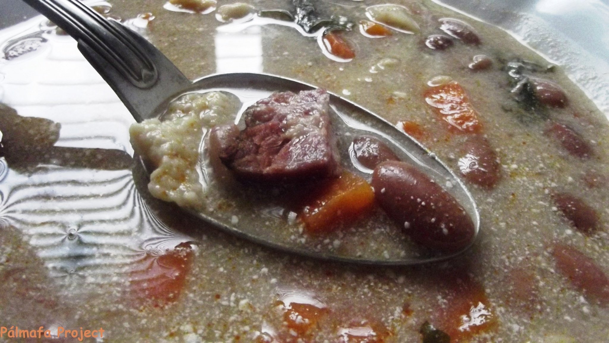 A leves fogadott „Őrangyalom” kérésére készült, aki egy nagyon jó barátom és már jó ideje nyaggatott, hogy főzzünk együtt, de ez valamelyikőnk elfoglaltsága miatt sokáig meghiúsult egészen múlt hétvégéig. Jó móka volt, úgy nézett ki a közös főzés, hogy Ő felbontotta a bort amit hozott és sűrűen kortyolgatott belőle. Én meg főztem. Most az életemmel játszom, mert ha ezt meglátja, tuti dühbe gurul, úgyhogy muszáj azt is iziben hozzátennem, hogy egyrészt nekem is töltött bort, másrészt én könnyítettem meg a dolgát, annyival, hogy az összes hozzávalót előkészítettem a főzésre mielőtt megérkezett. Beáztattam a babot és a húst, a zöldségeket pedig felszeleteltem, így tényleg nem sok meló maradt már vele. Felajánlottam ugyan neki, hogy a végén a rántást és a csipetkét elkészítheti, mert egyik feladat sem a kedvencem, de valahogy akkor éppen telefonált… Sebaj, lesz ez még így se, pontosabban lesz ez még fordítva hamarosan, ugye ugye? Természetesen örömmel főztem neki, mert megérdemli, még akkor sem morogtam magamban, mikor bablevest rendelt, pedig azon a héten már kb. kétszer ettem babot, de ennél nagyobb bajom sose legyen!