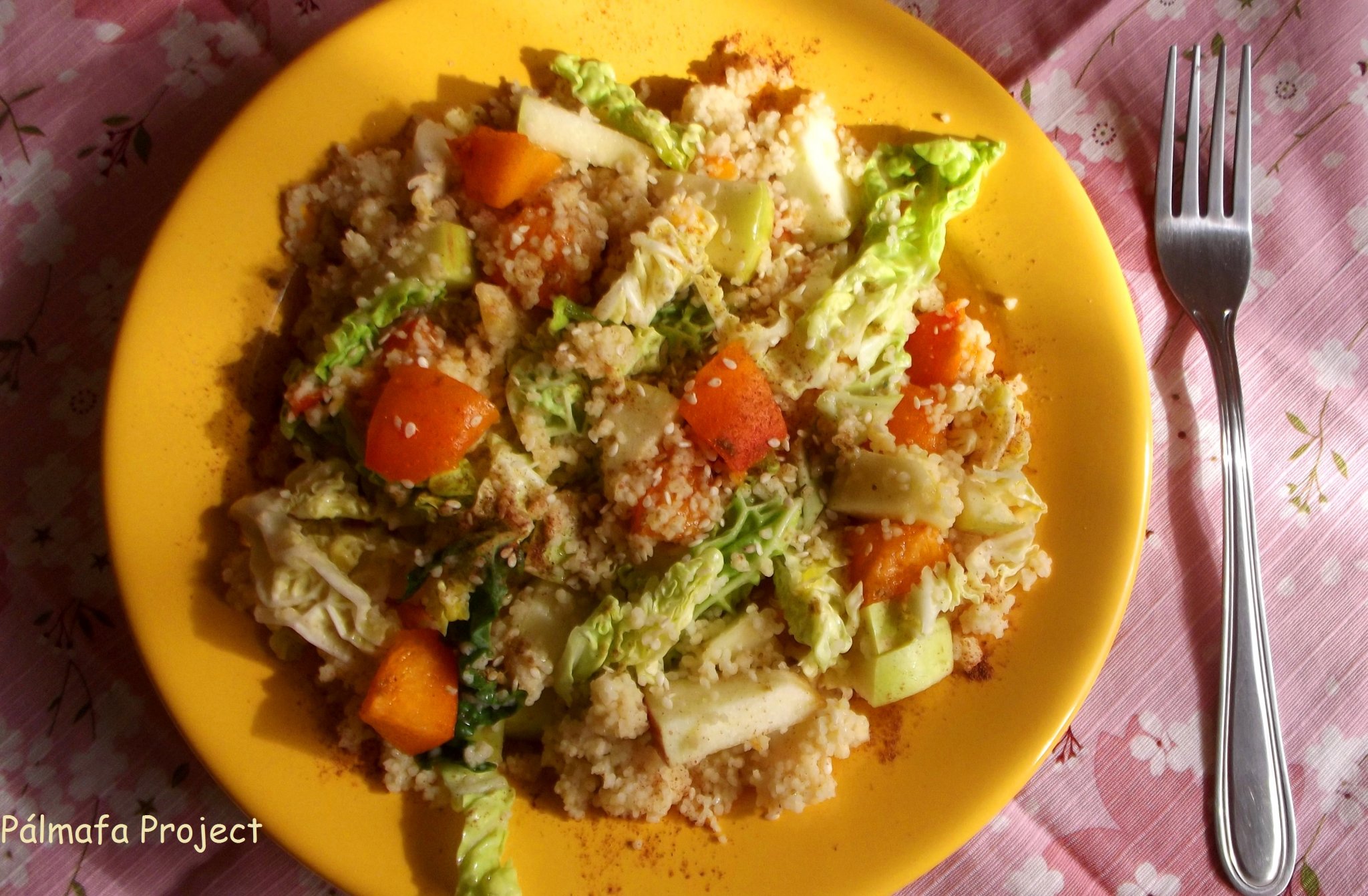 Az alma és a káposztafélék jó párost alkotnak ez nem meglepő, a puha barack édessége pedig kiegészíti őket, de helyette akár aszalt gyümölcsöt is használhattok. Viszont érik a sárgabarack, így adott volt, hogy ez kerül a tányéromra.