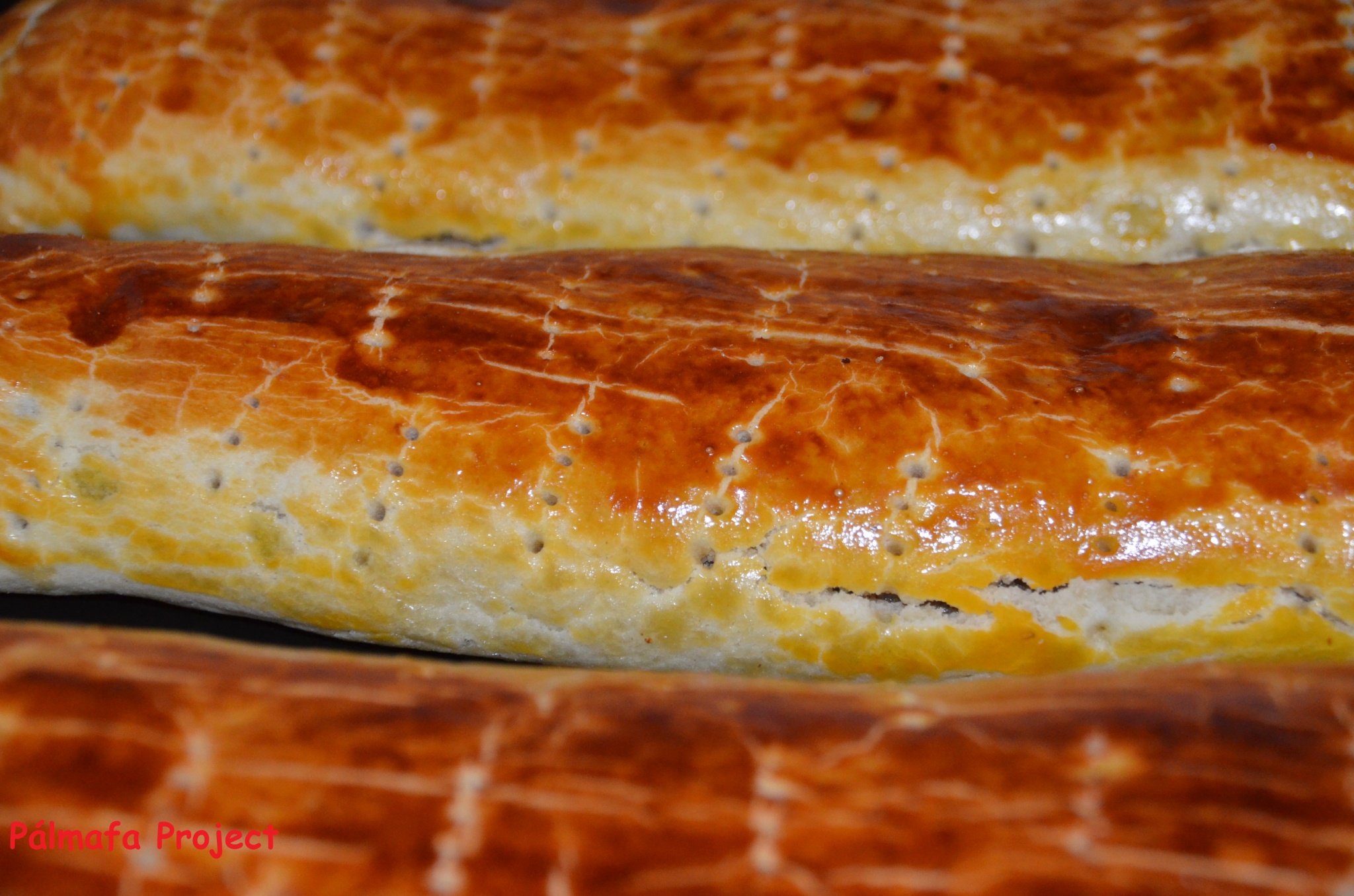 A 3 tésztát téglalap alakúra nyújtjuk és megkenjük a töltelékekkel, a két végét kb. 2 cm szélesen visszahajtjuk, majd hosszában feltekerjük. Lekenjük őket a két tojás sárgájával majd hűvös helyre tesszük, míg a tojás rászárad, ezután lekenjük a fehérjékkel is, és ismét hideg helyen hagyjuk pihenni, míg az is rászárad. Végül villával megszúrkáljuk és mehet a 180 fokra előmelegített sütőbe, kivajazott tepsin, kb. 45 percre.
