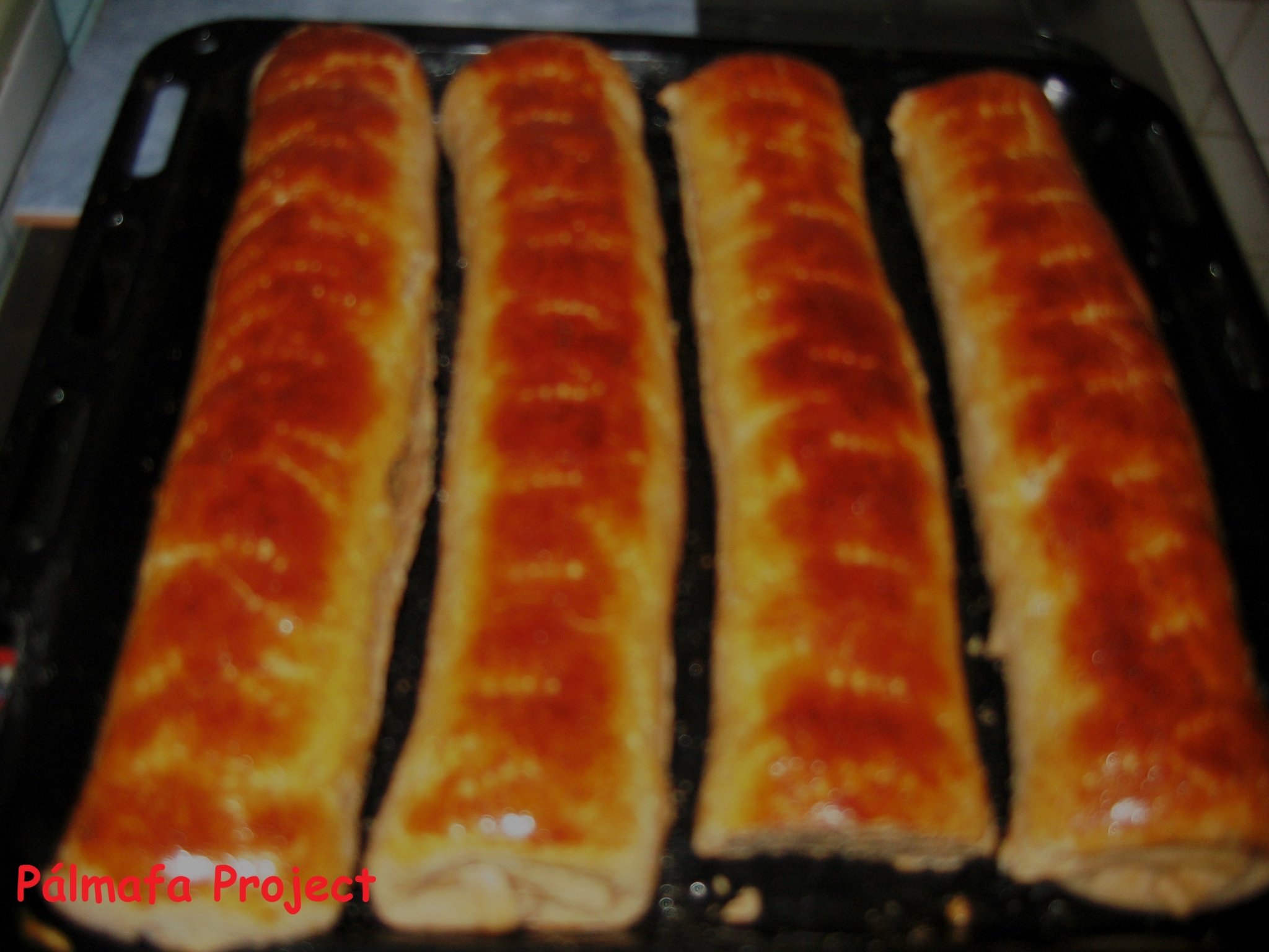 A tésztát 4 részre osztjuk, kb. 30 dkg-os adagokra. Lisztezett deszkán kb. 35 x 20 cm-es téglalapokra nyújtjuk. Mindkét tölteléket megfelezzük és rákenjük a kinyújtott tésztalapokra, majd hosszában feltekerjük a végeit pedig behajtjuk maga alá és kivajazott tepsire tesszük. A tetejüket megkenjük a 2 tojás sárgájával, majd pihentetjük fél órát, aztán megkenjük a felvert fehérjékkel is, ami után szintén pihiznek egy fél órát. Óvatosan megszúrkáljuk villával a tetejüket, végül 180 fokra előmelegített sütőben kb. 25-30 perc alatt megsütjük. Jó megvárni, míg kihűlnek, én általában nem bírom és a végét lekanyarítom, csak, hogy ellenőrizzem, hogy tényleg finom….