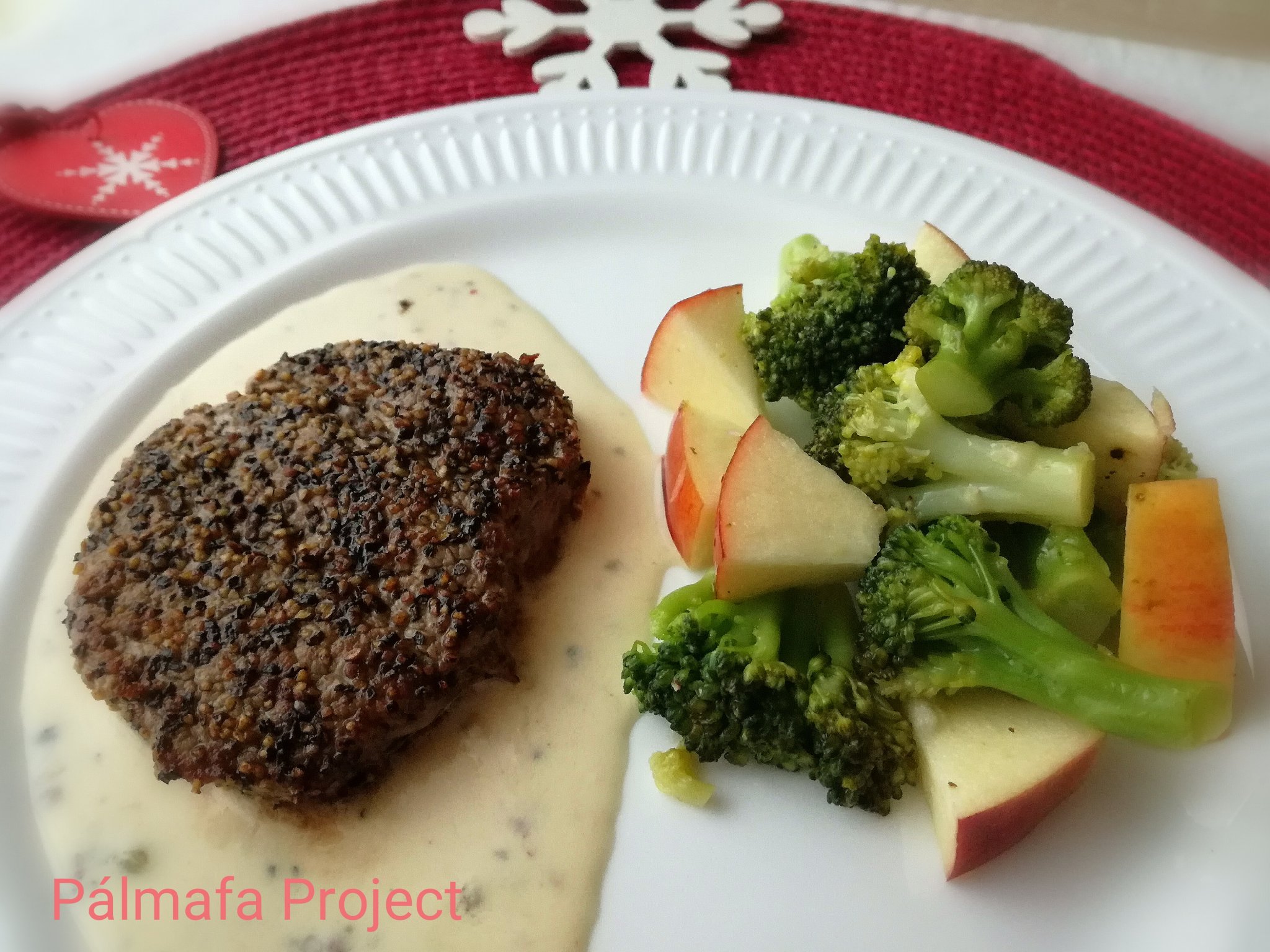 A színes borsot mozsárban kicsit összezúztam. Amíg a hús pihent, a mártás hozzávalóit összeforraltam pár perc alatt a serpenyőben, míg a tejszín sűrűsödni kezdett. A vizet inkább apránként adagoljátok hozzá, nehogy túl híg legyen. Mikor elkészült a tányérra kanalaztam a salátából és a mártásból, majd ráfektettem a hússzeletet is. Csak frissen jó!