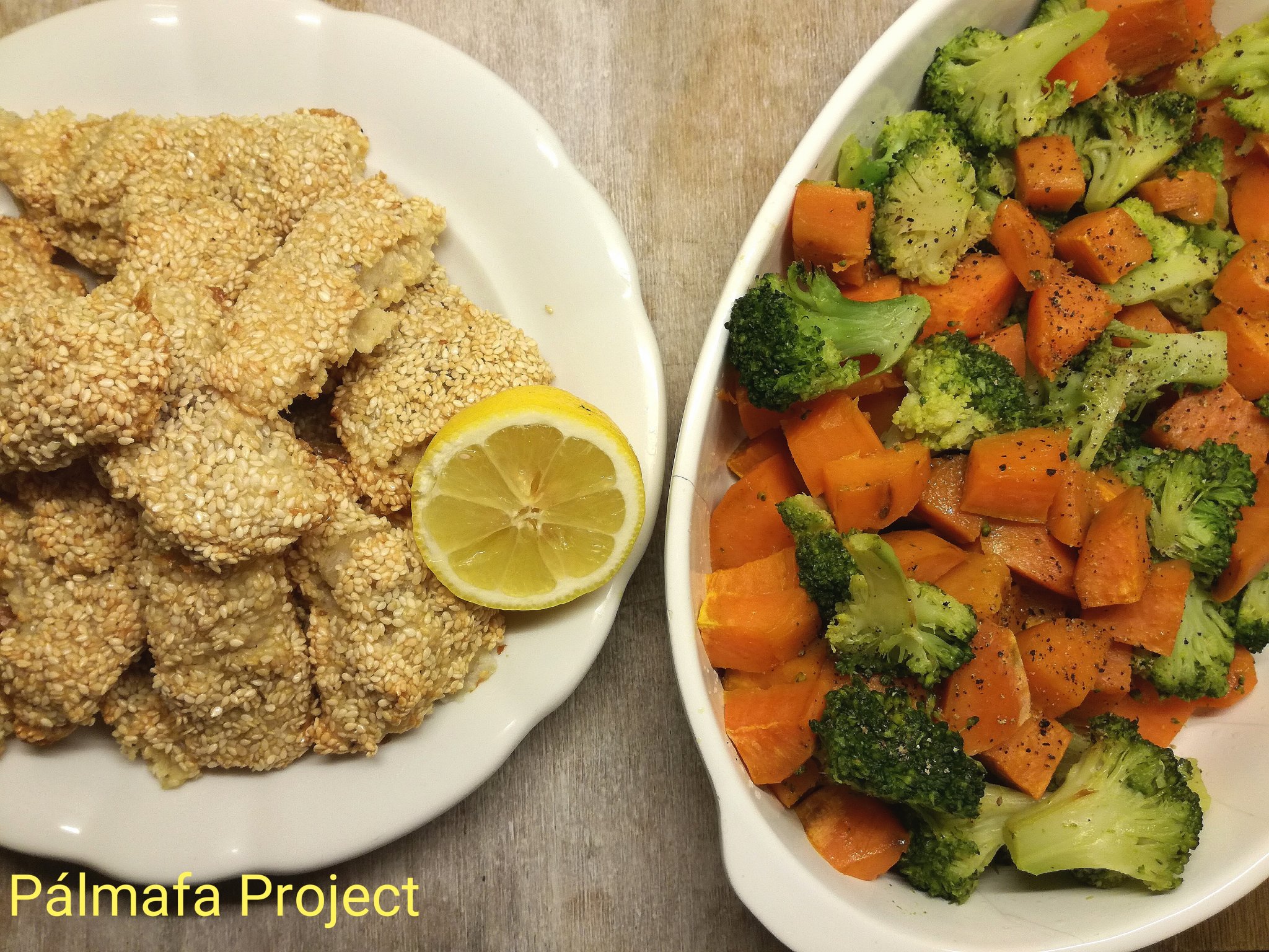 Szezámos halrudacskák sült brokkolival és édesburgonyával