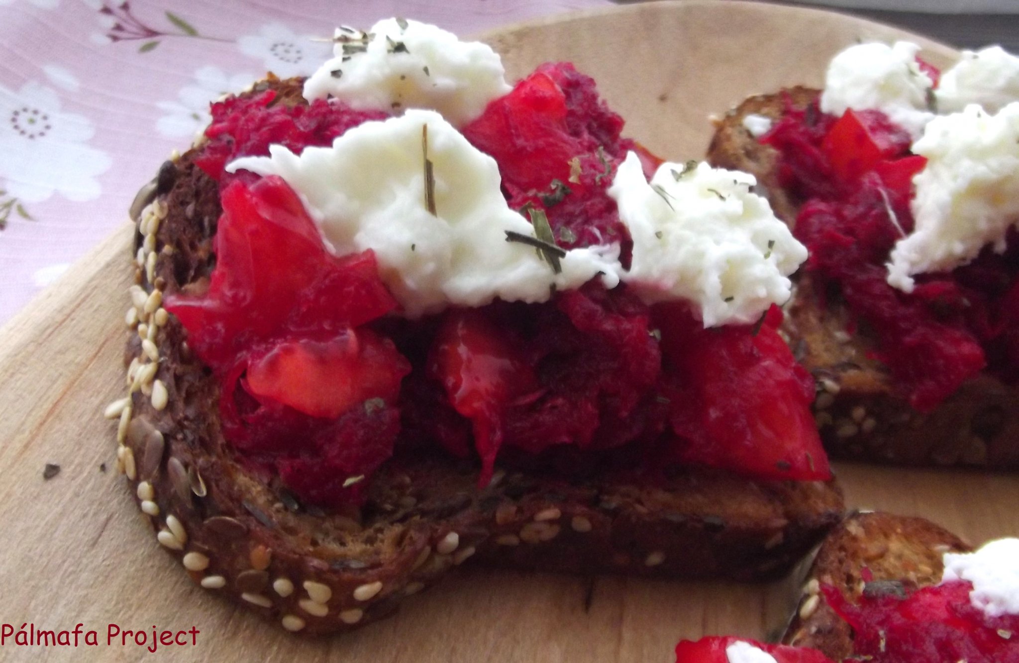 A céklát apró lyukú reszelőn lereszeltem, a paradicsomot kis kockákra vágtam, hozzáreszeltem a fokhagymákat, fűszereztem, meglocsoltam az ecettel és az olajjal, majd a pirítósra halmoztam, a tetejére pedig mozzarellát tépkedtem.