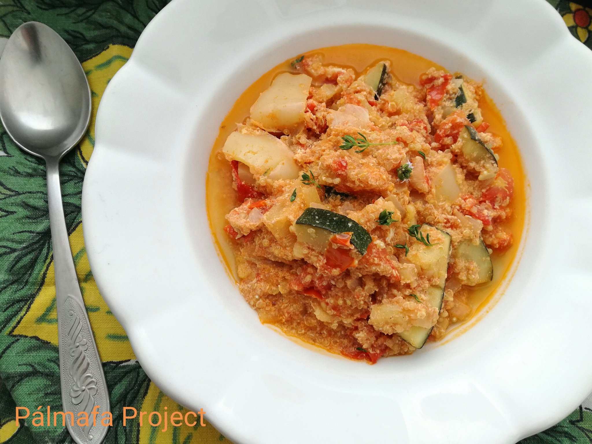 Ez az étel valahol átmenet a magyaros és a francia lecsó között, hiszen cukkini már van benne, és a tetején a kakukkfű is elviszi mediterrán irányba, a quinoát meg egy  hirtelen meggondolásból borítottam bele a végén, mivel elég sok levet engedtek a zöldségek, így kellett valami ami felszívja. A fehér kenyér helyett a quinoa pedig egy roppant egészséges megoldás, mert pár perc alatt megfő, viszont mégsem tolakodó az ételben, csupán kiadósabb a végeredmény. Ha attól tartanátok, hogy valamelyik családtag így nem enné meg, hát azt javasolom nem mondjátok el neki, hogy quinoa van benne, ugyanis nem igazán észrevehető, pláne, ahogy a tojással elkeveredik.