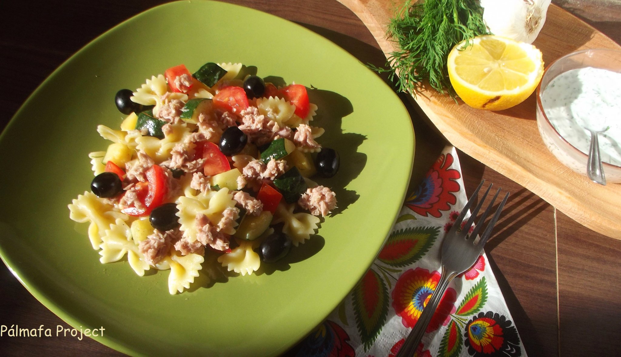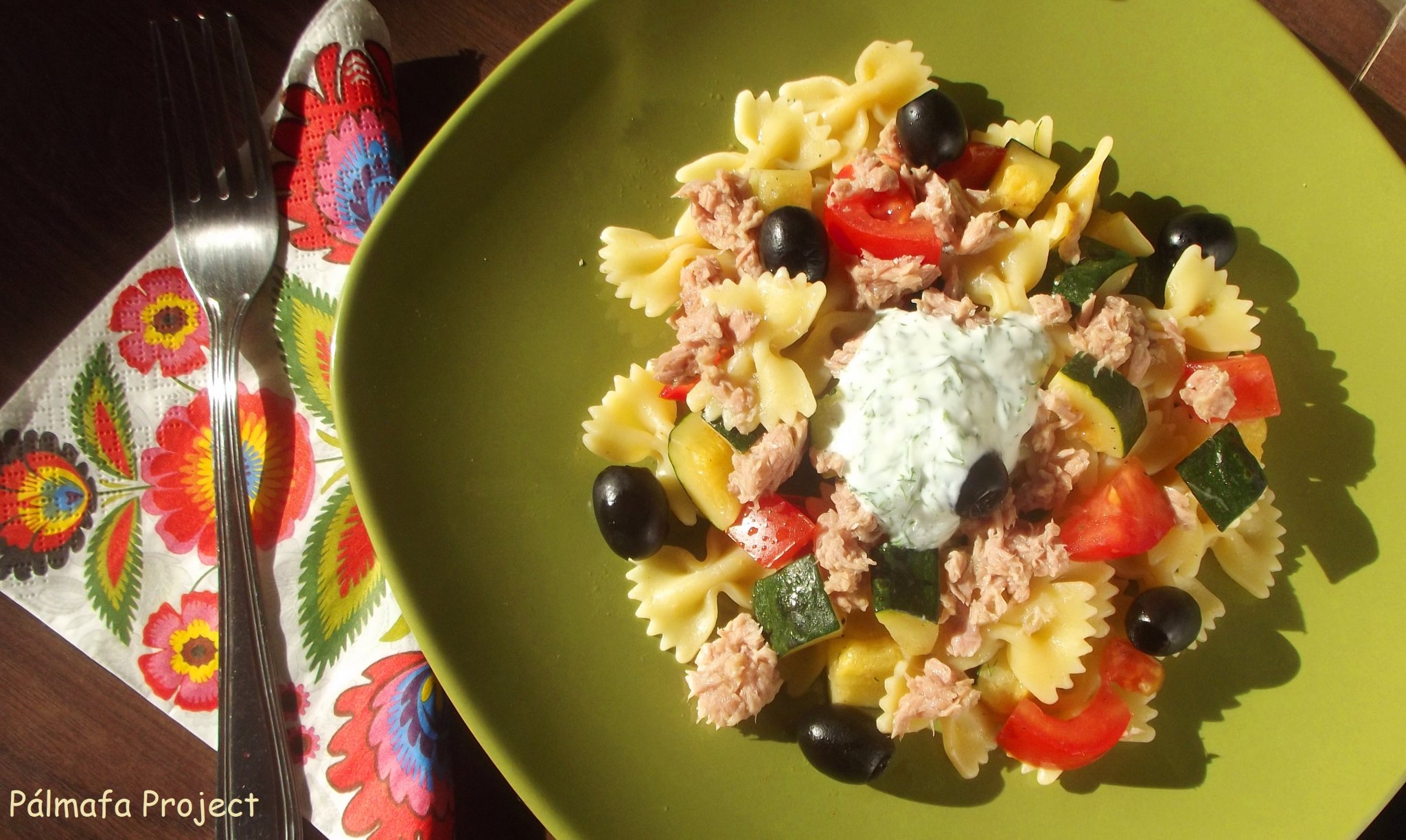 A tésztát leszűrtem és hozzákevertem a cukkinihez, majd egyből tálaltam, facsartam rá citromlevet, megszórtam még olívabogyóval és meglocsoltam a fokhagymás kapros öntettel, amit előtte kevertem össze.