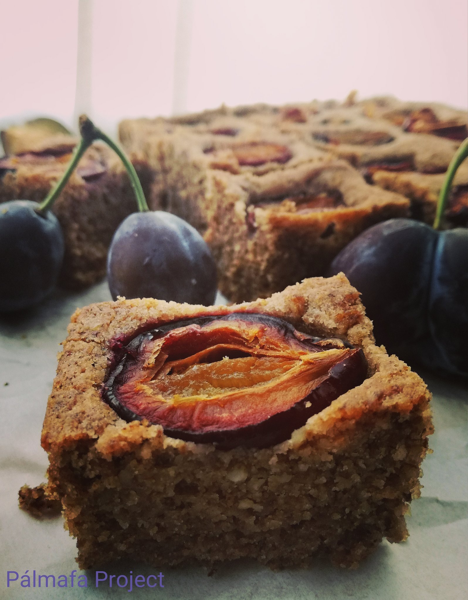 180 fokra előmelegített sütőben, sütőpapírral bélelt tepsibe öntöttem a masszát, a tetejét kiraktam fél szilvadarabokkal és kb. 30 perc alatt átsült, tűpróbával ellenőrizni kell. Miután kihűlt, szépen szeletelhető.