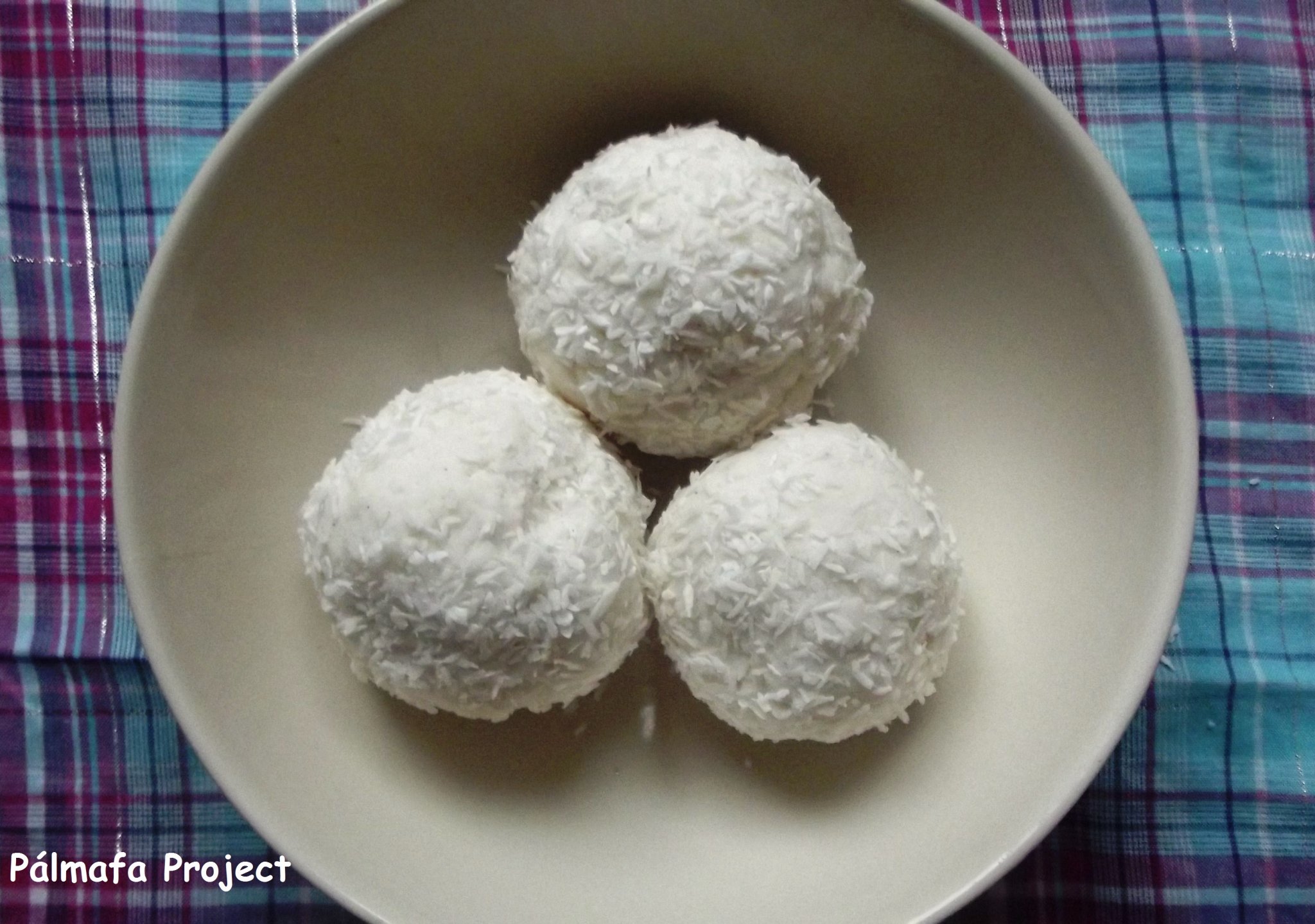 A kókuszreszeléket ledaráltam, nem szükséges teljesen por állagúra, de így jobban összeáll utána. Egy tálba öntöttem, belekerült a többi hozzávaló is és kézzel összedolgoztam az egészet. Diónyi nagyságú vagy talán picit nagyobb gombócokat formáztam belőle. Azonnal is elmajszolható, de jó tesz neki ha áll egy órát a hűtőben.