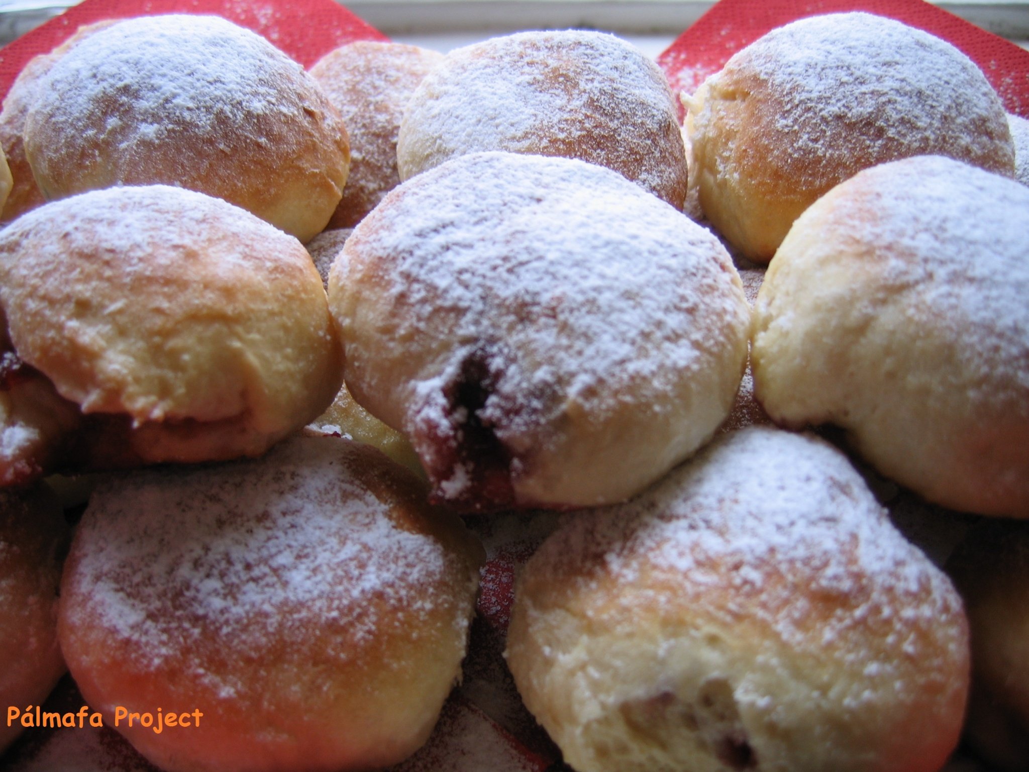Ezután kézzel még egyszer átgyúrtam a tésztát, majd 4 felé vágtam, amiből vastag rudakat sodortam, amit 6 felé vagdostam. Mindegyik darabot kissé kilapítottam és egy-egy kanál lekvárt tettem a közepében, majd összezártam a széleit és gombócokat formáztam belőlük, majd áttettem őket a sütőpapírral bélelt tepsire az összecsippentett felükkel lefelé. Ismét kelesztettem őket fél óráig. Addig előmelegítettem a sütőt 190 fokra és kb. negyed óra alatt pirosra sültek.