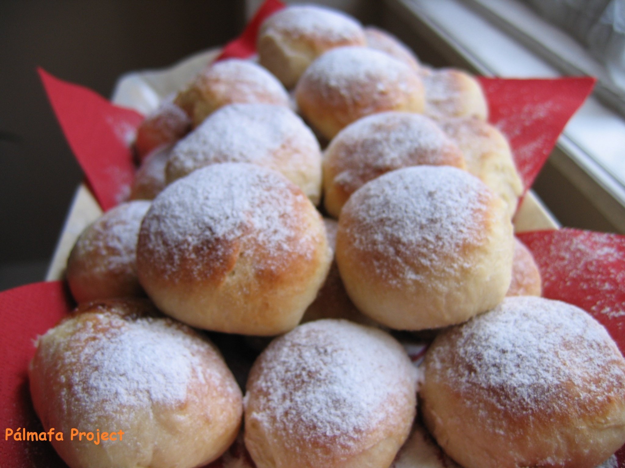 Én csak simán megszórtam őket porcukorral, de ha valaki az eredeti recept szerint készíti, akkor a cukorból és a vízből főzzön szirupot, amibe egy pillanatra mártsa bele a fánkokat, aztán kerüljenek a porcukorba.