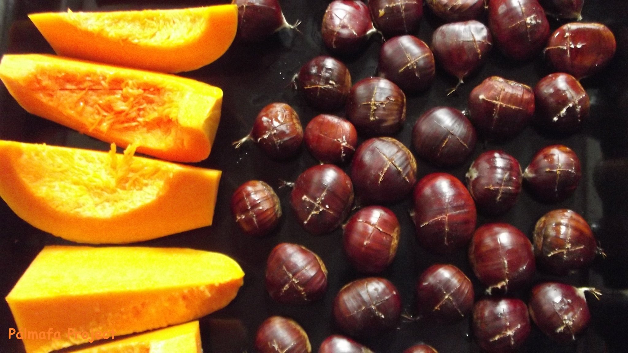 A sütőt előmelegítettem 200 fokra. A gesztenyékre vizet engedtem, és egyenként pici keresztet vagdostam a héjukra majd átkerültek egyből a sütőlemezre. A gesztenyéket azért fontos bevágni, mert  egyetlen gesztenye felrobbanása a sütőben negyed  óra sütőtakarítás jelent… Kb. 20-25 perc alatt megsülnek, a héjük a vágás mentén felpöndörödik. Ne nagyon várjuk meg míg teljesen kihűl, mert utána sokkal nehezebb megpucolni, ráadásul meg is keményednek. Azbeszt kezűek előnyben. A barna vékony hártyát is le kell szedni róla sajnos, de ha jó minőségű a gesztenye könnyen lejön, ha mégsem akkor azokat áztassuk be picit vízbe.