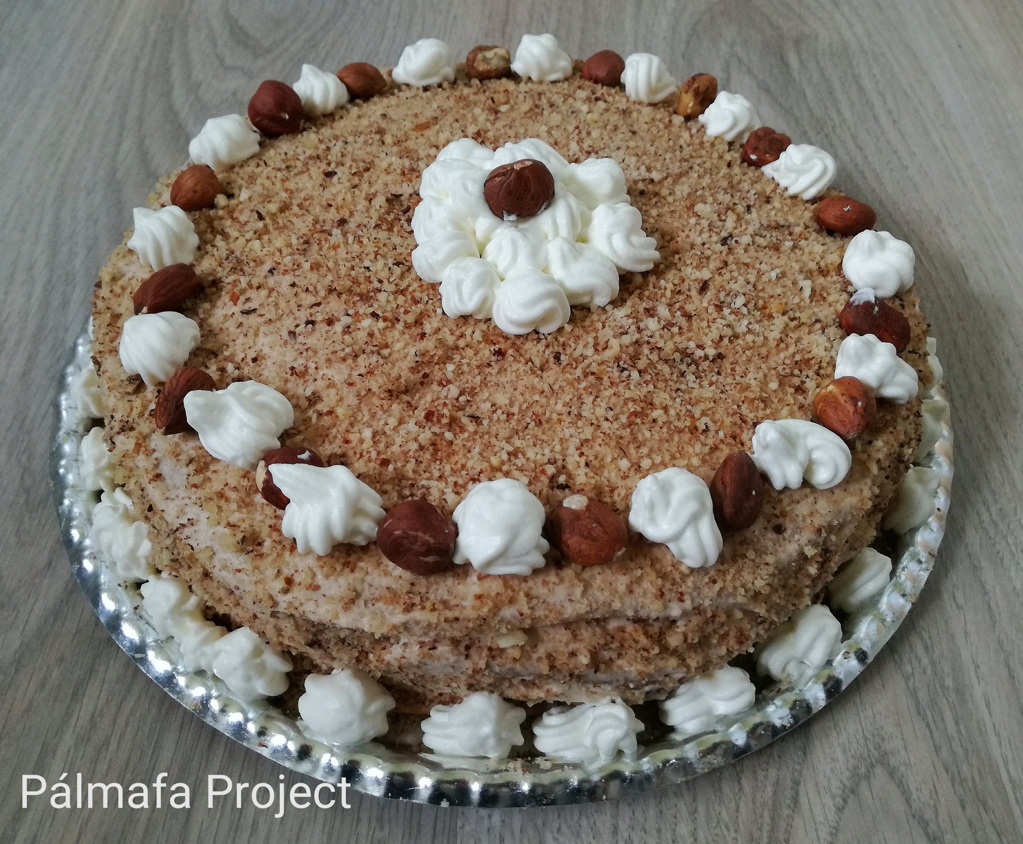 A krémhez felvertem a tejszínt, majd belekevertem a cappuccinoport és a likőrt. Egy tortalapot megkentem a krém ötödével majd ráhelyeztem a következő lapot és így tovább, míg el nem fogyott, a végén pedig az oldalát is bekentem krémmel, megszórtam a darált mogyoróval, a felvert habot habzsákból rányomtam körben, majd egész mogyoróval díszítettem, majd egy éjszakát állt a hűtőben.