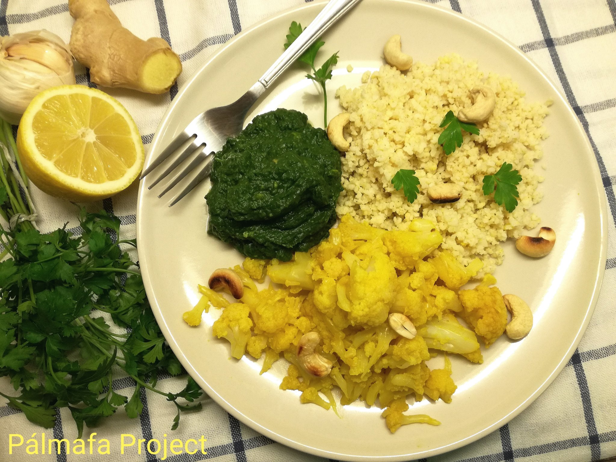 A spenótot kevés kókuszolajon megpároltam, fűszereztem, hozzáreszeltem a fokhagymákat, lefedtem, míg összeesett, majd hozzáreszeltem a gyömbért és botmixerrel pürésítettem, majd a karfiollal valamint a kölessel tálaltam.