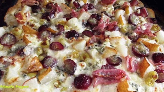 Mikor megkelt, kézzel még egyszer átgyúrtam. Ezután osszuk el tetszőlegesen attól függően hány darabot és mekkora nagyságúra szeretnénk nyújtani. Én inkább a vékony tésztájú pizzát szeretem, így azt egy sodrófával kb. fél centi vastagságúra nyújtottam, majd kiolajozott tepsibe tettem. Megpakoltam a félbevágott és kimagozott szőlőszemekkel a körtedarabokkal, rámorzsoltam a márványsajtot és a széttépett sonkadarabokat is ráhelyeztem. 220 fokon kb. 10-15 perc alatt megsült.