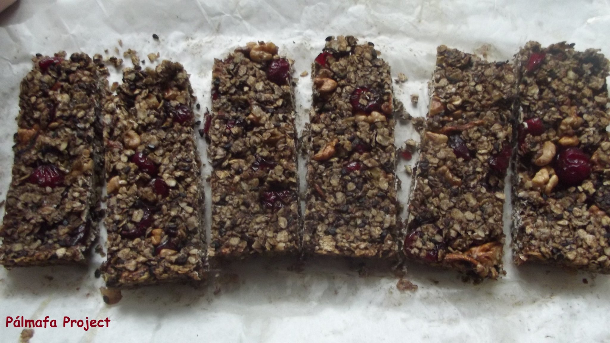 Tényleg bátran variálhatóak a hozzávalók, bármilyen aszalt gyümölcs, kókuszreszelék, kakaó, magok mehetnek bele, a lényeg, hogy legyen benne valami kötőanyag, vaj, méz, vagy kókuszolaj, ami összetartja a masszát, így könnyen felszeletelhető és nem esik szét. Ha utóbbi mégis megtörténne, semmi baj, joghurtba, tejbe keverve tökéletes reggelire. A nedvességtartalmát a reszelt gyümölcs adja, így később sem lesz túl száraz. Lehet csokoládés ízt is varázsolni bele, akár étcsokidarabokkal, vagy ahogy most én tettem, karobporral. Valaki sütőbe sem tolja be, hanem egyből a hűtőbe teszi és megvárja míg a vaj visszadermed. Én inkább átsütöttem pár perc alatt az egészet, így a dió is picit megpörkölődik és még jobb ízű lesz a végeredmény.