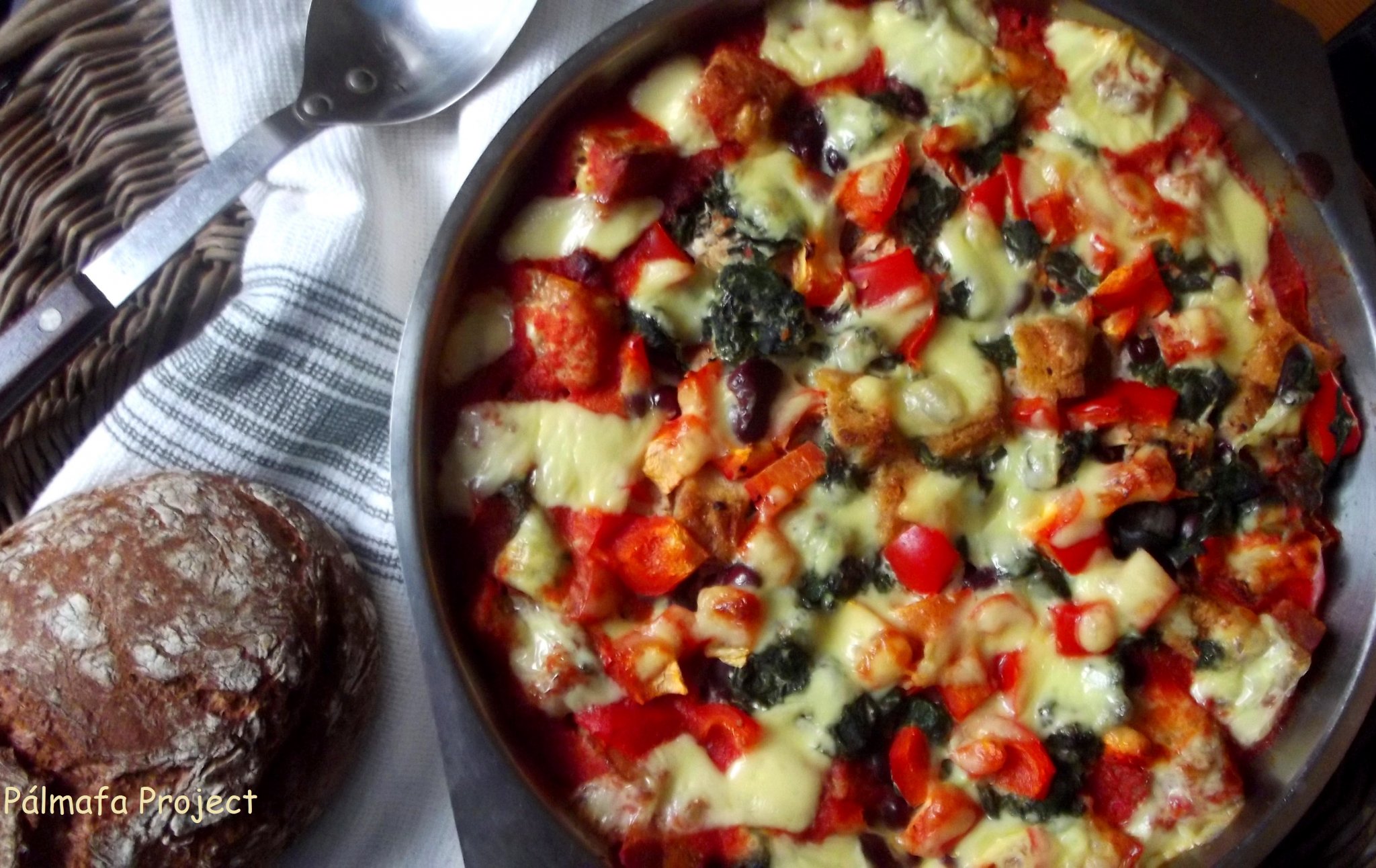 Az arany barnára pirult kenyérkockákat egy kör alakú hőálló tálba tettem, megszórtam a spenóttal, paprika kockákkal, és a babbal, végül ráöntöttem a tojásos keveréket, a tetejére pedig ráreszeltem a sajtot.