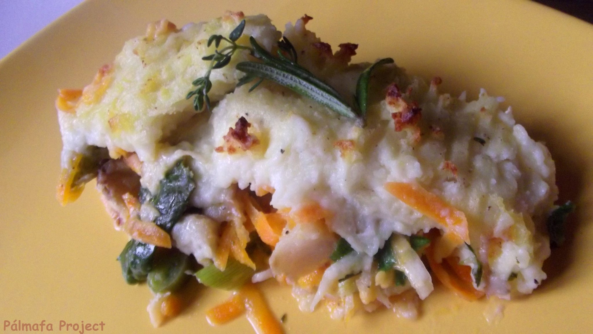 Mikor a krumpli megpuhult, leszűrtem, krumplinyomóval összetörtem, adtam hozzá vajat, tejszínt, reszeltem bele szerecsendiót és krémesre kevertem, majd a halas, zöldséges keverék tetején egyenletesen eloszlattam és kb. 40 percig sütöttem, míg a teteje elkezdett pirulni.