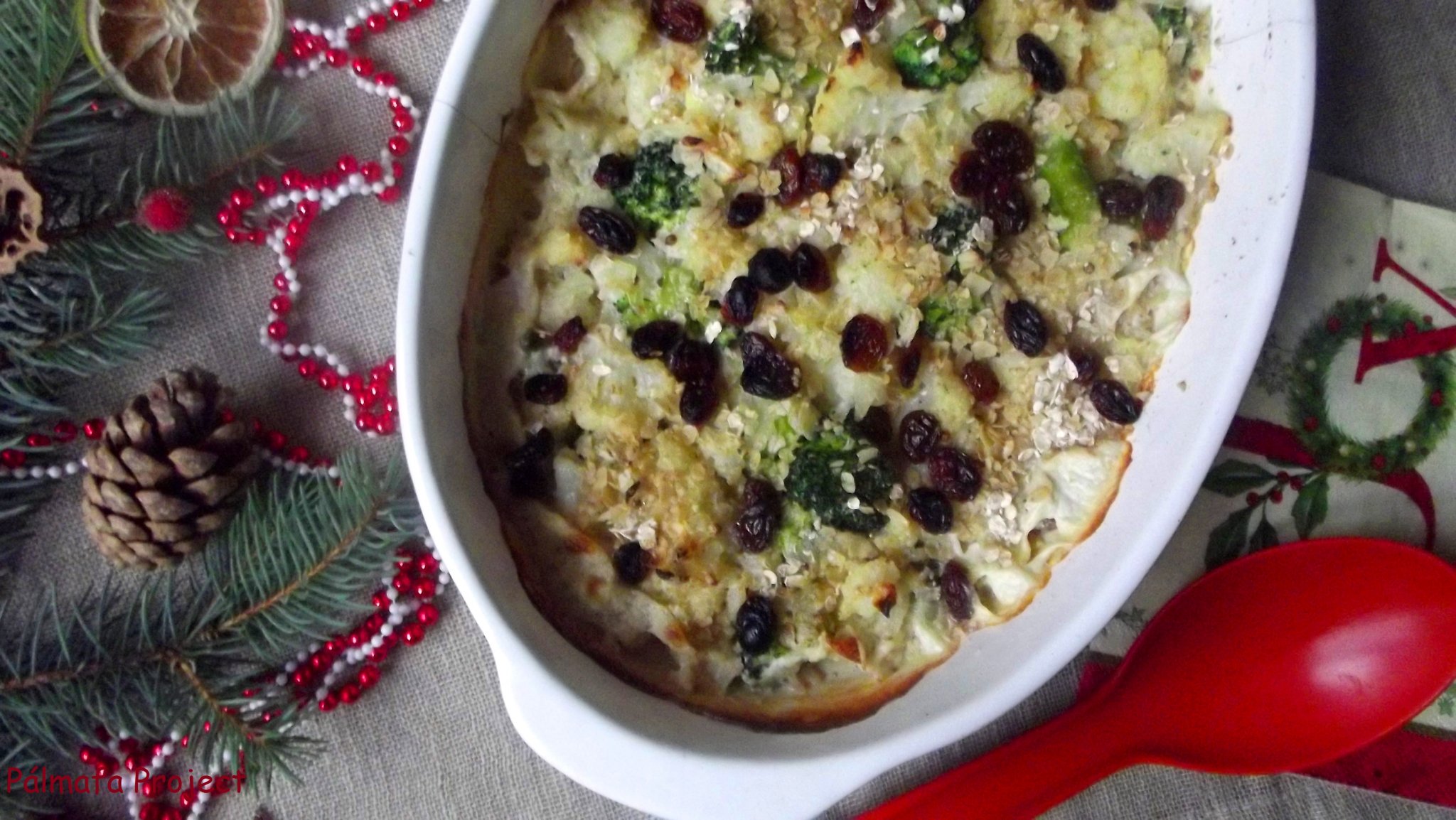 DSCF5319Megjegyzem én sem gondoltam soha, hogy ilyesmivel bibelődök, nem mintha bonyolult lenne, de nekem vigyázni kell, mert simán elmajszolom nyersen a dekorációt mielőtt elkészülne… Szóval brokkoli és karfiol volt terítéken, szerintem mindkettő különösen jól passzol a halhoz, de a sült  húsokhoz is. Került rá még mazsola és zabpehely is, előbbi édes ízével beleillet a keleties fűszerezésű tejszínes mártásba, utóbbi pedig a zsemlemorzsát helyettesítette.