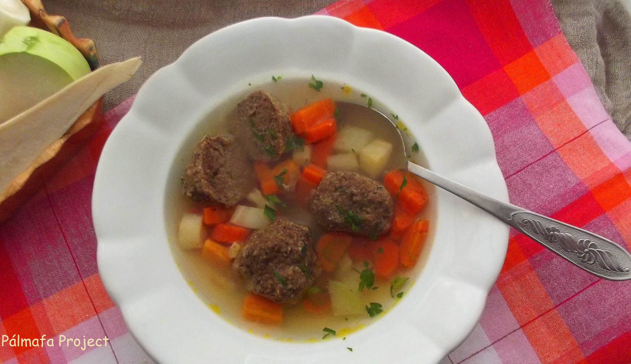 Ezalatt összeállítottam a gombócot. A májat egy kés hegyével pépesre „kapartam”, majd hozzáadtam a többi hozzávalót, a fokhagymát reszelve, alaposan elkevertem, majd állni hagytam, míg a zöldségek majdnem teljesen átpuhultak. Ekkor nagyobb diónyi gombócokat formáztam a masszából és a levesbe tettem, mikor a feljöttek a gombócok a felszínre, még kb. kaptak 5 percet és elzártam a gázt alatta, végül friss petrezselyemmel szórtam meg a levest a tálaláskor.
