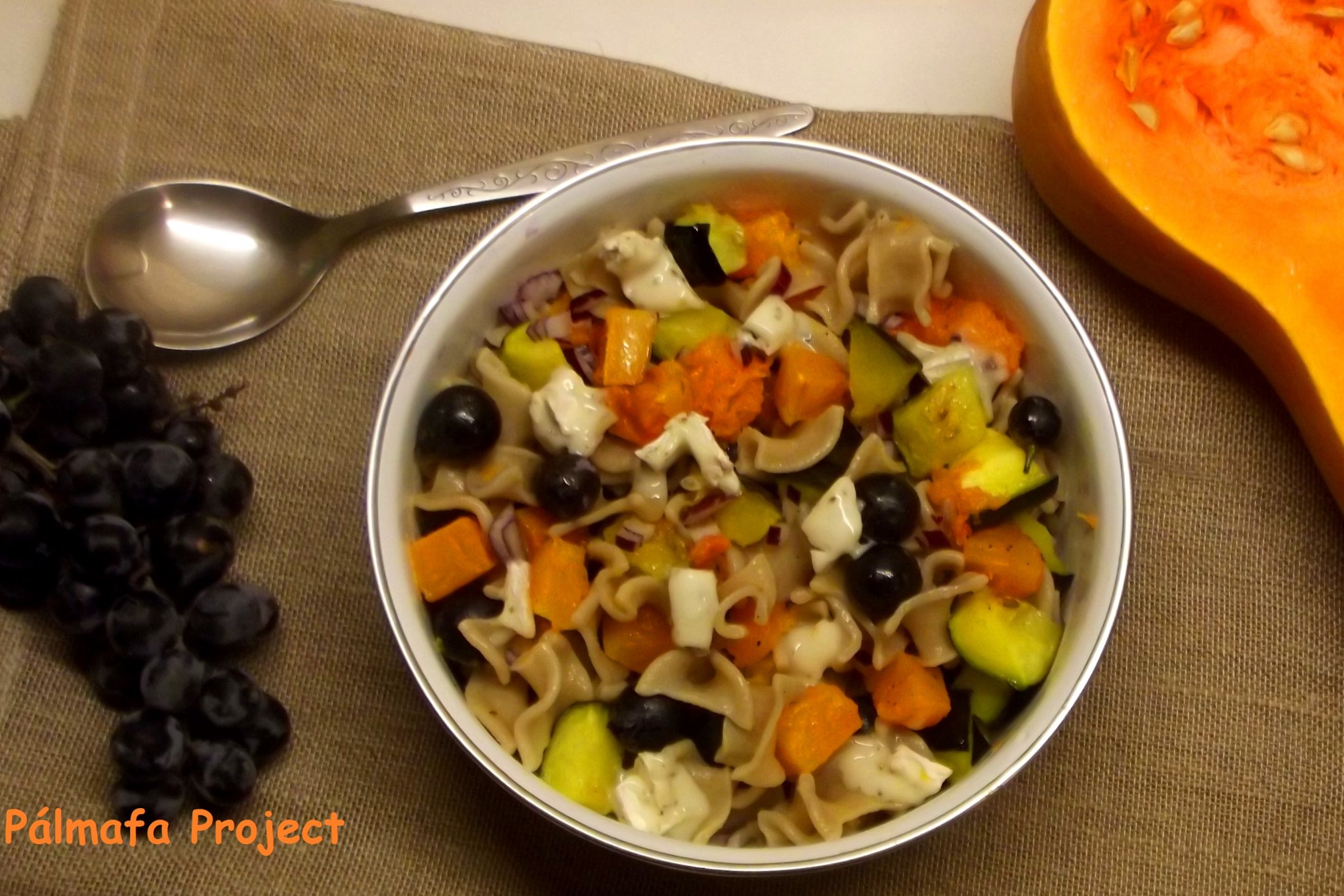Színes, vitamindús, egyszerű, gyors, laktató, nem túl költséges, benne vannak az ősz ízei. Ennél jobban nem tudom összefoglalni azt hiszem ennek a tésztának a jó tulajdonságait, úgyhogy egyszerűen kóstoljátok meg. Furcsának tűnhet, hogy mit keres egy tányéron a szőlő, a sütőtök és még a cukkini is bepofátlankodott, de abszolút megbocsájtható ez neki, mert passzolnak az ízek, a lilahagymától és a krémes sajttól pedig életre kelt az egész. Na jóóó verset írni azért nem fogok az ebédemről, de az biztos, hogy bármikor szívesen megenném.