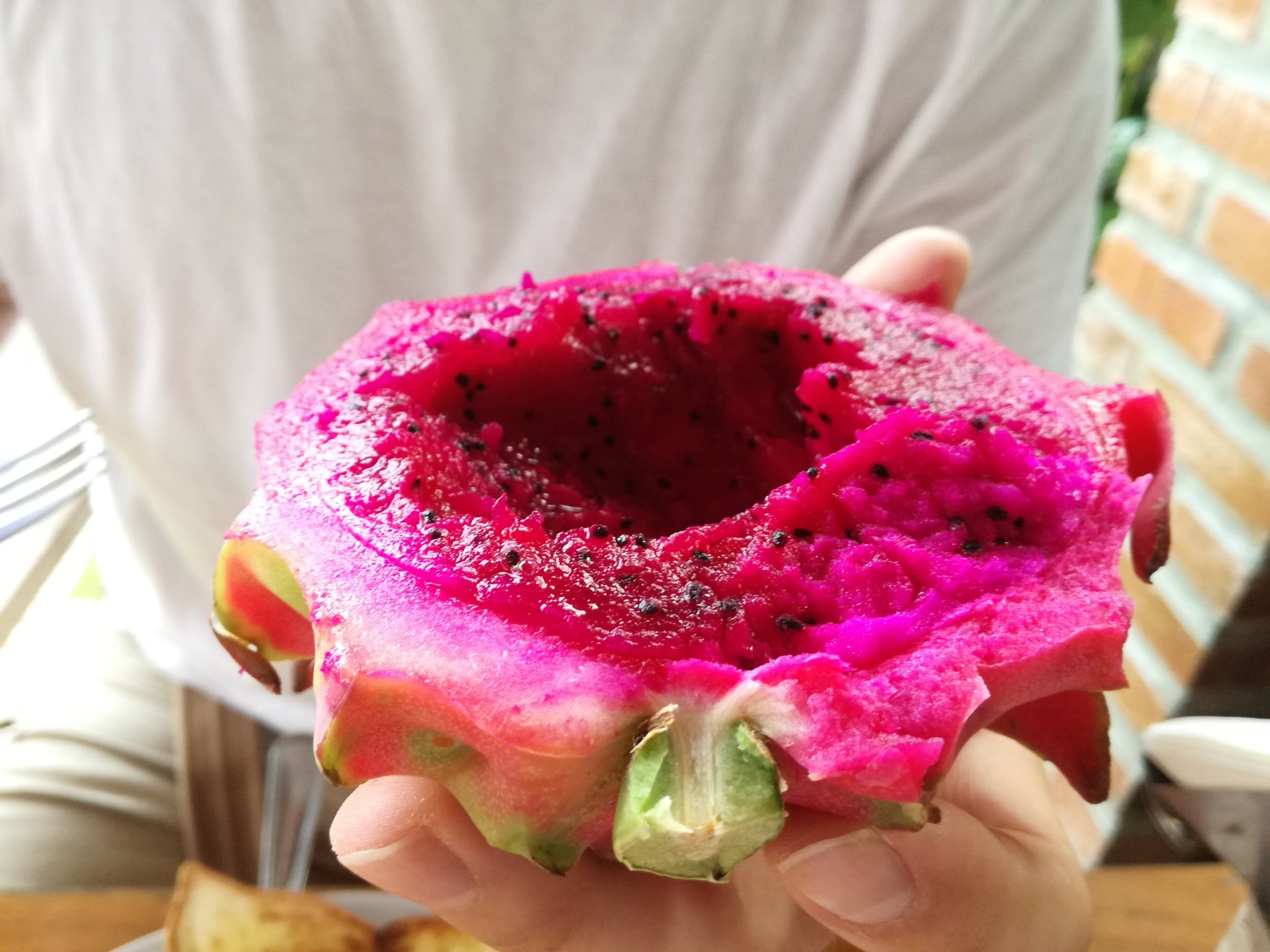 A sárga gyümi a passió gyümölcs vagy más néven maracuja, otthon is kapni néha, recept még a blogon is található vele. A zöld héjú pedig narancs, de az íze, mintha keresztezték volna a grapefruittal, a kinézete meg zöld citromra hajaz. Ő pedig itt a sárkánygyümölcs félbevágva. Ebből eddig én azt a fajtát ismertem, ami belül fehér, fekete pöttyökkel, de ez a lila szín mesés, édes, és könnyedén kikanalazható.