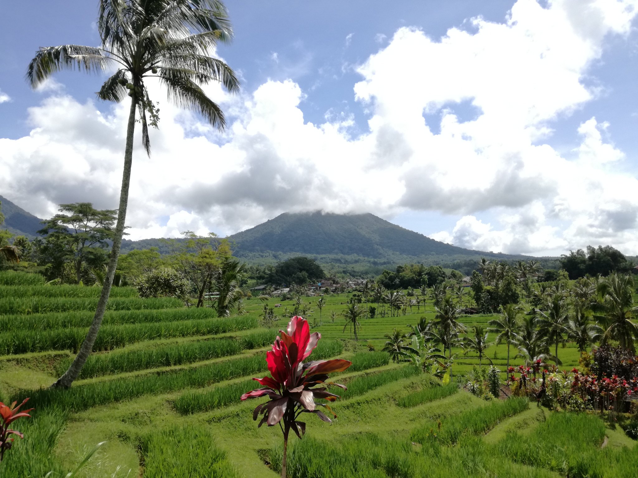 Szóval első állomásunk a Jatiluwih település mellett található hatalmas rizsföld, ami látogatható és többféle túraútvonal közül választhat az idelátogató elvetemült turista, aki a déli hőségben kíván végigcsattogni rajta. Fél óránk volt, amiből persze egy óra lett, nem találtunk rövidebb ösvényt és amúgy is gyönyörű a táj, így elvesztünk kicsit a rizs birodalmában. A sofőrünk elmesélte, hogy ő is rizs termesztő és 3 féle rizst arat le a földjén félévente, fehéret, feketét és vöröset. A 3 féle rizs jelenlétét pedig a 3 istenséghez vezette vissza, hiszen a hinduknál Brahma, Siva és Visnu alakjában testesül meg az egy Isten. Ezért van minden településen 3 fő templom is, aztán ezenkívül még rengeteg, mert minden családnak külön temploma van és minden napra jut náluk valamilyen ceremónia, ahogy ő mondta, de esküvőre feldíszített kapukat is nagyon sokat láttunk, ami 3 napig tart…