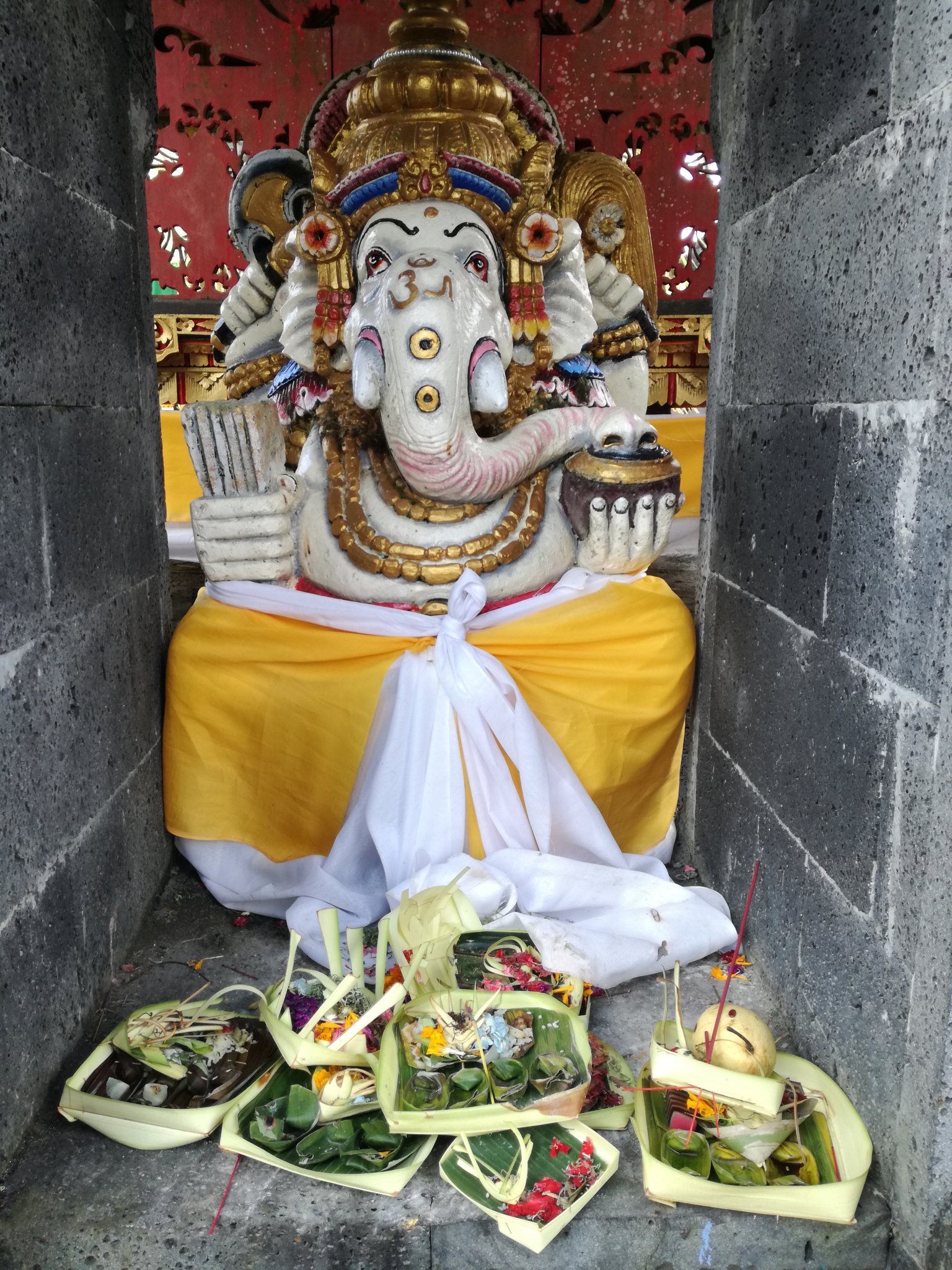 Kicsit már untuk itt a sok autózást, utólag már én sem így raktam volna össze ezt a napot, de késő délután megérkeztünk Kintamaniba a Ulun Danu Batur templomhoz, ahol éppen egy ceremónia zajlott, bár sok embert nem láttunk a templom előtt, de hangszórókból áradt valami fura hangú emberke szövege. Ahogy kipattantunk az autóból, itt tényleg letámadtak minket a helyi árusok, hogy vegyünk sarongot, mert anélkül nem mehetünk be, de nem hagytuk magunkat, hiszen nálam volt, beszereztem már egy rakással, A férfi meg tudta, hogy úgyis odaadják bérbe egy kisebb összegért és nem kell azt megvenni. Amúgy jól áll a sarong a pasiknak is, titokban beszereztem egyet A férfinak is, jó lesz az itthonra szürke téli estéken…