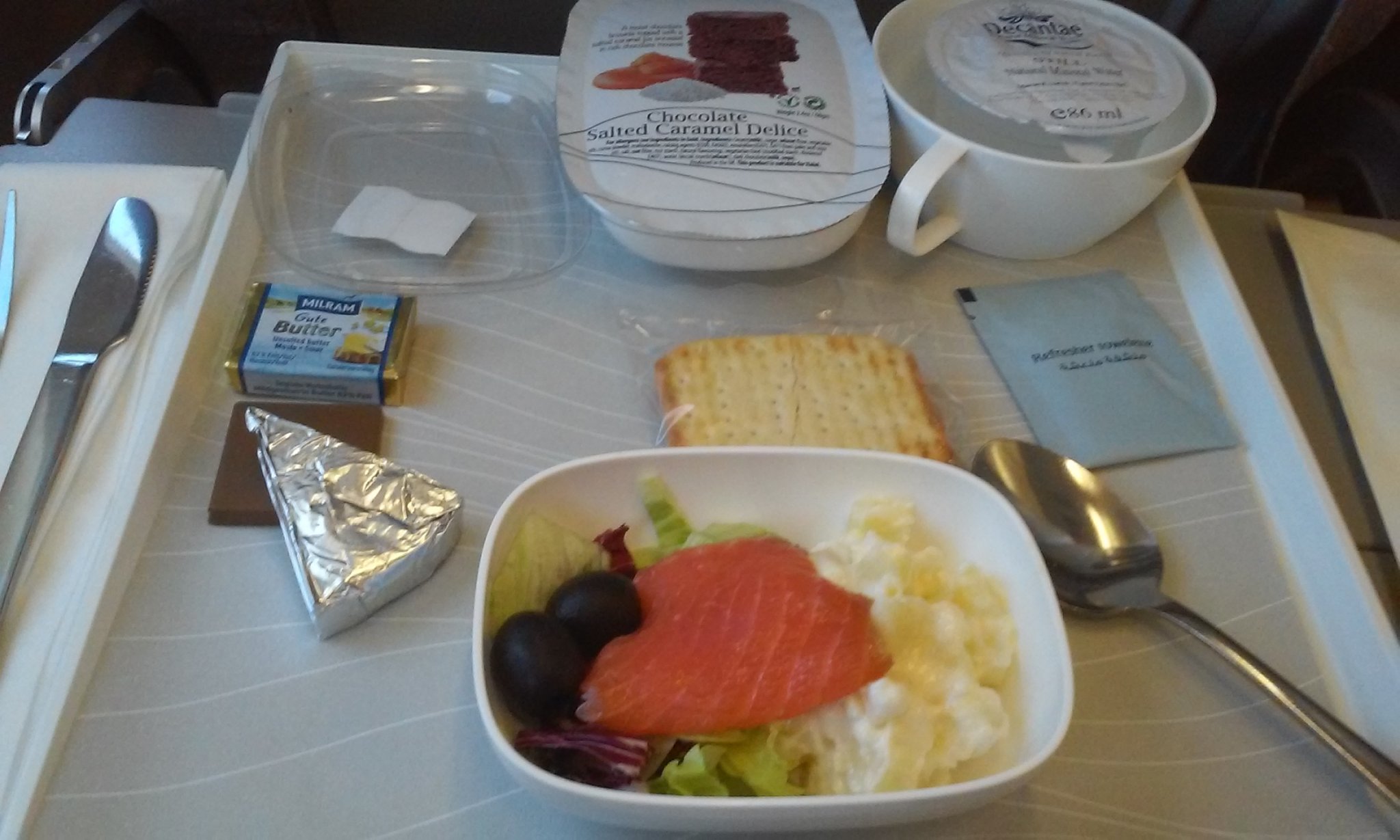 Hajnali fél 3kor ismét a fellegekben jártam, a reggeli volt tán csak felejthető, furcsa volt választani a sajtos omlett és a csirke curry közül, gondoltam utóbbi nem biztos, hogy jól esne hajnalban, de a gépen terjengő illatokból ítélve rájöttem, hogy mégis ez volt a kapósabb, annyira, hogy a mellettem utazó hölgy le is maradt róla. Így omlettel érte be ő is, bár megállapítottuk, hogy ezt nyilván nem most dobták össze a pilótafülkében ez inkább csak tojásport látott, de ismét volt hozzá spenót fenyőmaggal. Ééés curry ízű zöldségfasírt.
