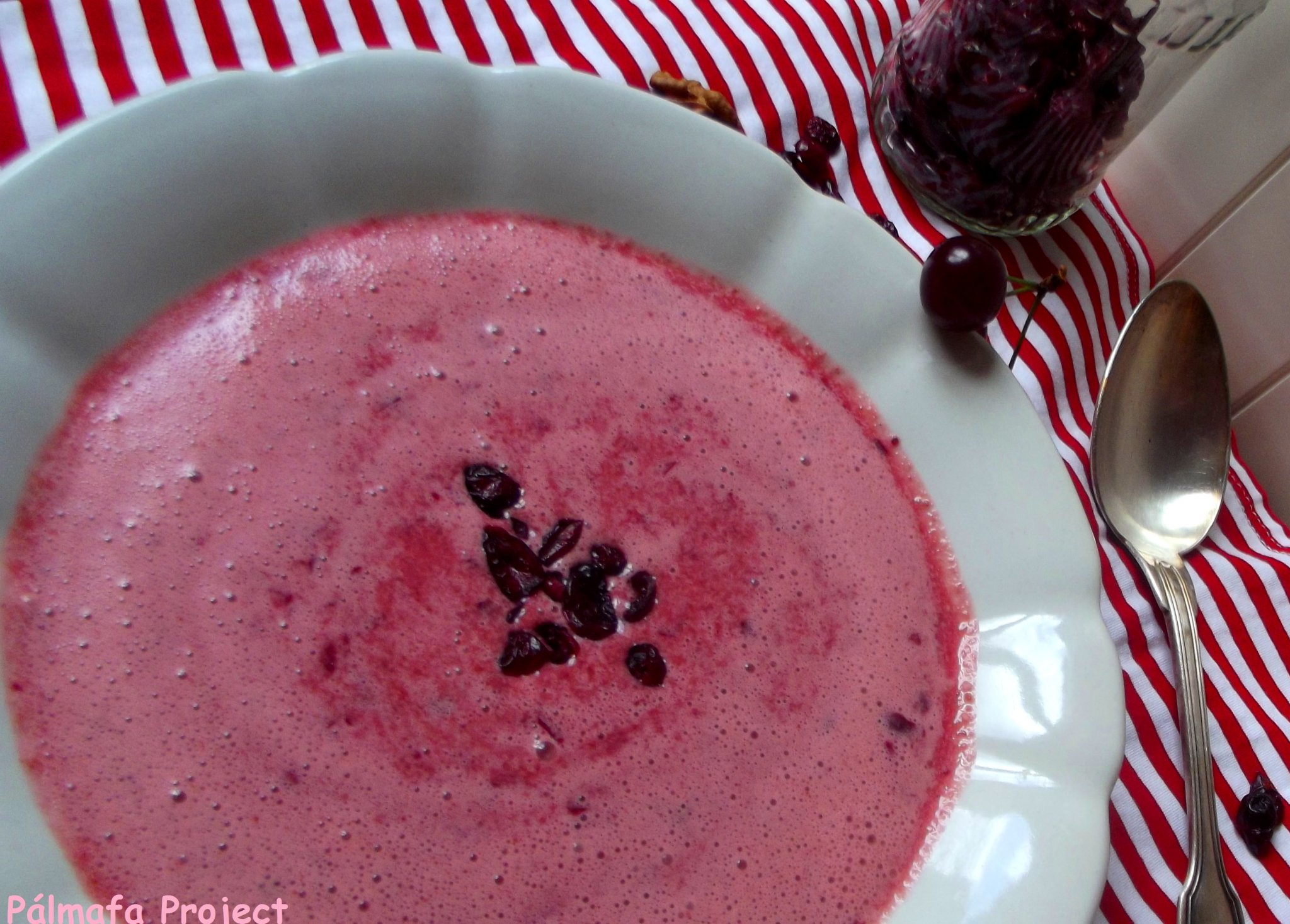 Itt a következő főzés nélküli gyümölcsleves, ami az egyik kedvencem, mert darált dióval sűrítettem, az pedig nagyon jól passzol a meggyhez. Az „A” terv az volt, hogy ribizliszemek kerülnek bele majd az áfonya helyett, de miután fél óráig köröztem sasmadárként a piacon, feladtam a vadászatot, aznap az összes ribizli elbújt előlem, úgyhogy jött a „B” terv, ami nem volt….De mivel éppen a magárus előtt bámészkodtam, így lecsaptam az aszalt vörösáfonyára, ami a fekete áfonyával ellentétben nem aranyárban kapható.
