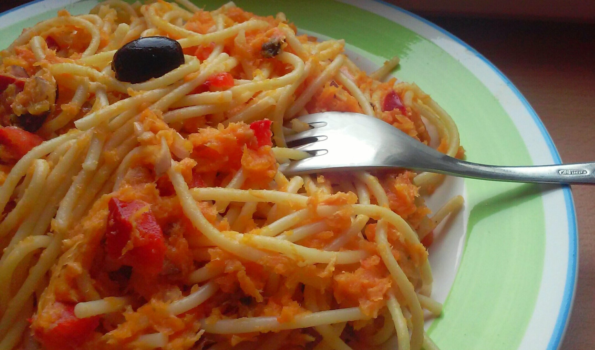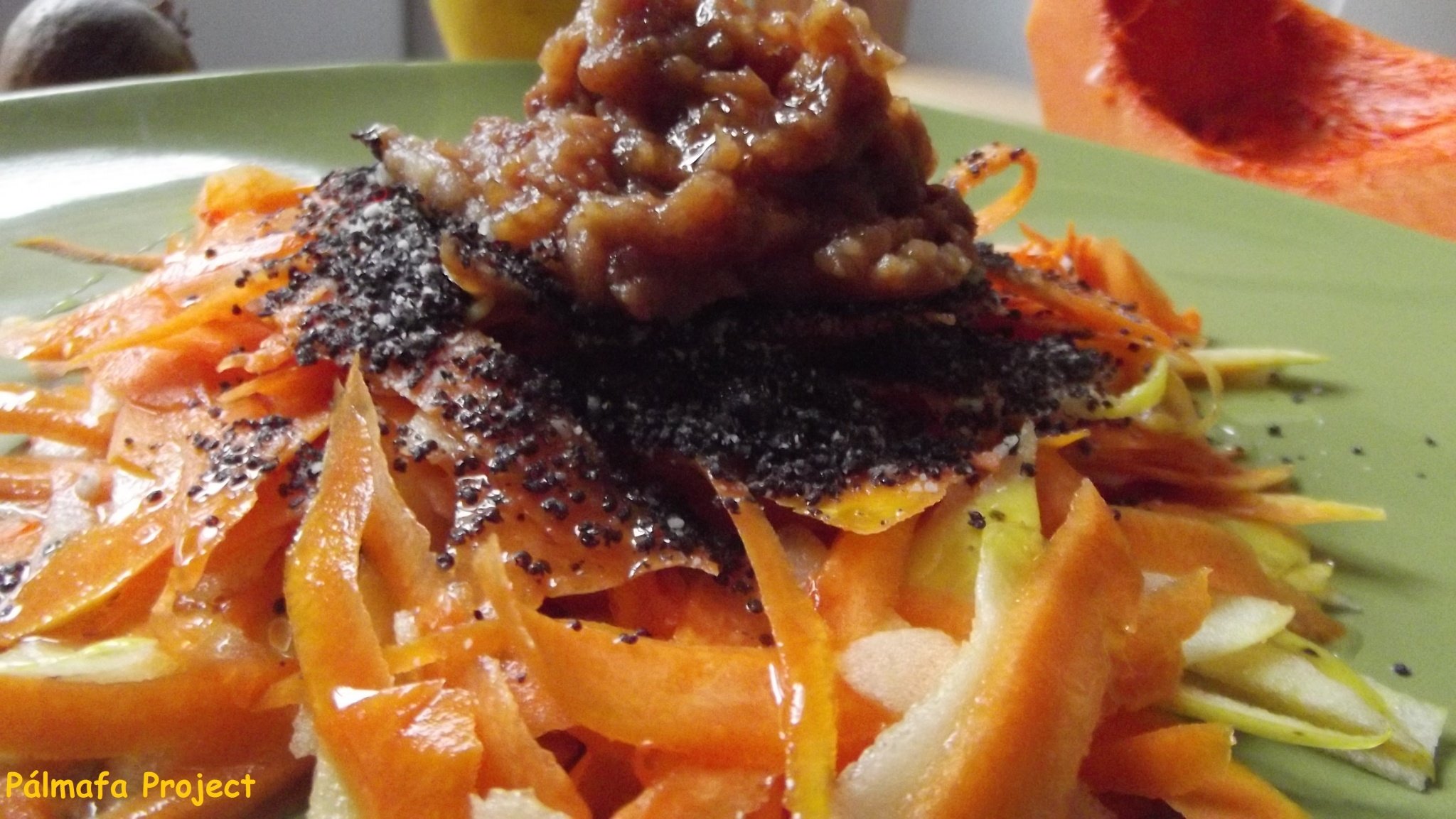 Az alapja sütőtök és alma egy hámozóval vékony csíkokra vágva. A tök ezúttal nyersen kerül az ételbe, abszolút alkamas rá, nem kell megijedni tőle, nem kemény, és édes íze van. Elsősorban a sütőtöknek, a magok alatti részét érdemes belecsíkozni, mert mindig ott a legédesebb a húsa, az alma pedig még rásegít erre.