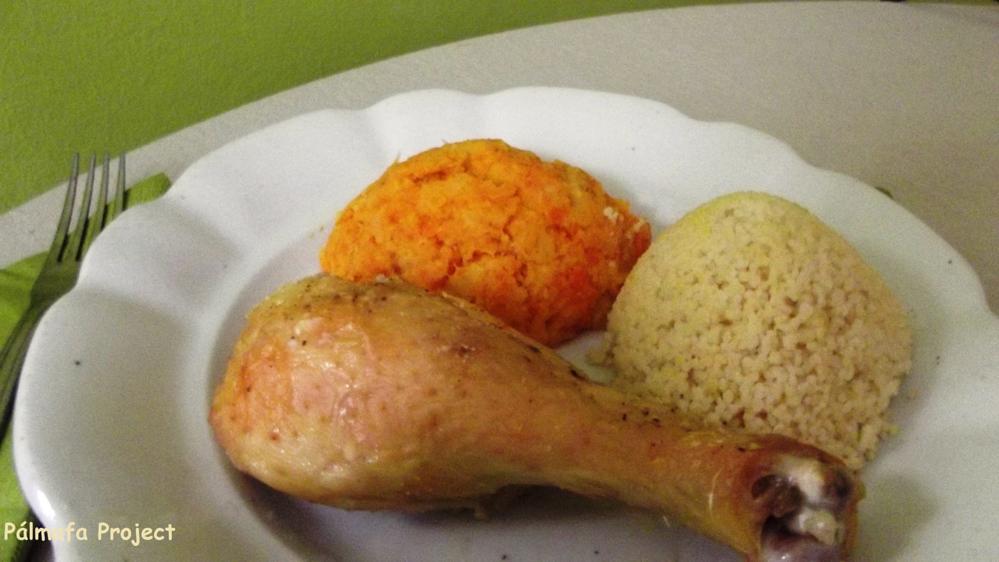 A legnépszerűbb vasárnapi fogások egyike volt gyerekkoromban ez a csirke, nem csak azért, mert egy csepp olaj sem kell hozzá, hanem mert grillsütő nélkül is piros ropogós sült csirke lesz a végeredmény a sónak köszönhetően. A héten már „sóztam” ugyebár a himalája sóval, de ehhez a recepthez tökéletes az asztali só is a tepsi alját beborítani, és nem kell félni nem lesz túl sós tőle az étel. Nincs még egy olyan étel amiben hajlandó vagyok megenni a csirke bőrét, de ez esetben azzal kezdem, mert ropog. Nem szoktam egész csirkét sütni, de nyugodtan lehet ezzel a módszerrel azt is, de egy-két futómű kedvéért is érdemes nekiállni. Munka pedig nincs vele szinte semmi, ami szintén ételünk mellett szól. A szép sárga köret sárga- és fehérrépa püré volt, ami gyakorlatilag párolt répa kevés vajjal pépesítve, só, bors, szerecsendió társaságában, illetve egy kupac kuszkusz is került mellé.