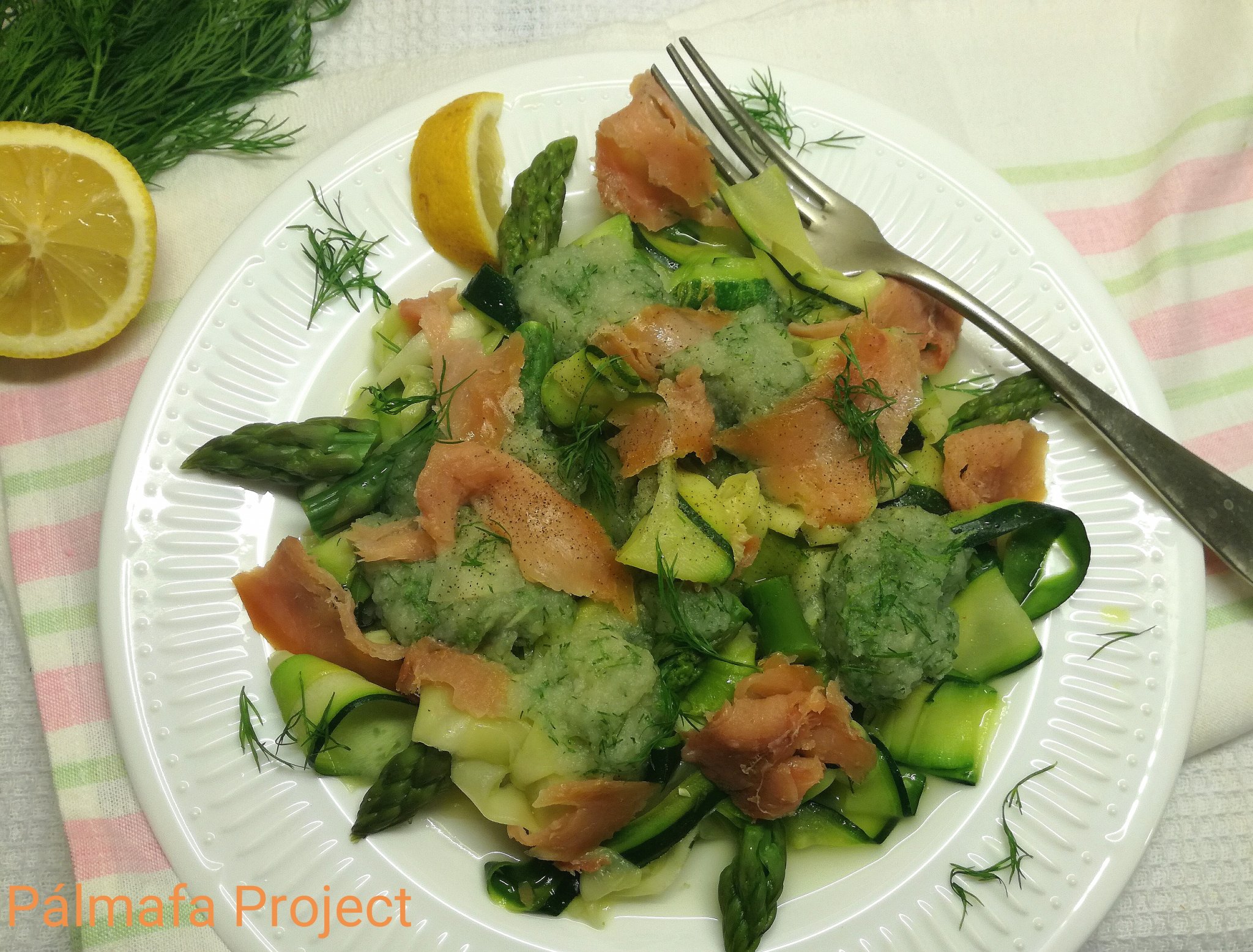 Tálaláskor a tányérra tettem egy kupac cukkinit, rászórtam a spárgát, rákanalaztam pár adag karalábépürét, majd a lazacdarabokat is ráhelyeztem. Pár csepp citromlé és olívaolaj, friss kapor és elkészült.