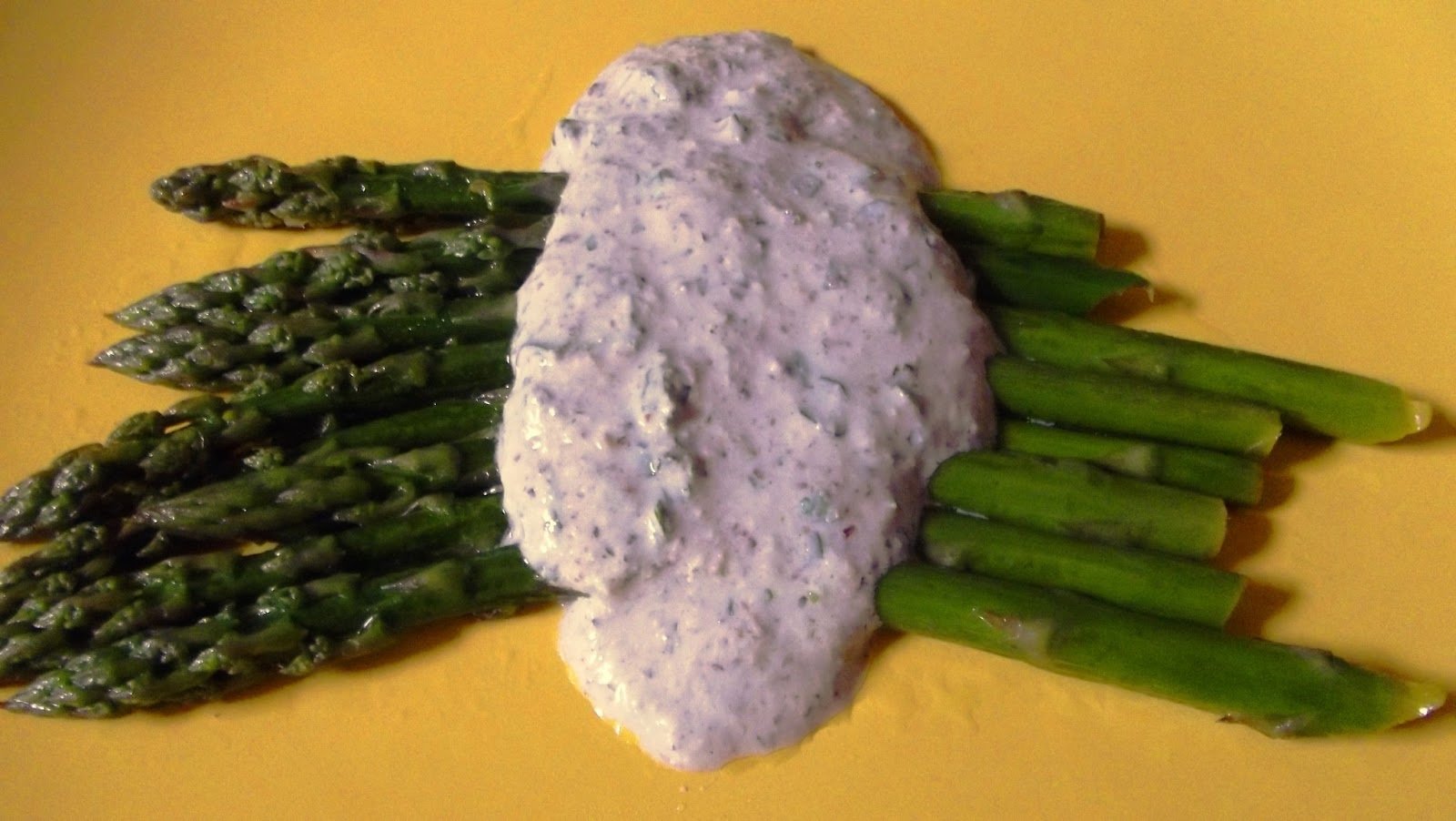 A spárgát egészben beledobtam forrásban lévő vízbe, amibe tettem pici sót, 1 teáskanál citromlevet és 1 teáskanál nádcukrot. 10 perc alatt megfő, utána néhány perc alatt átforgattam még egy serpenyőben amibe előtte egy kanál olívaolajat hevítettem. Közben a petrezselymet felaprítottam összekevertem a dióval a joghurttal valamint pici sóval és borssal.