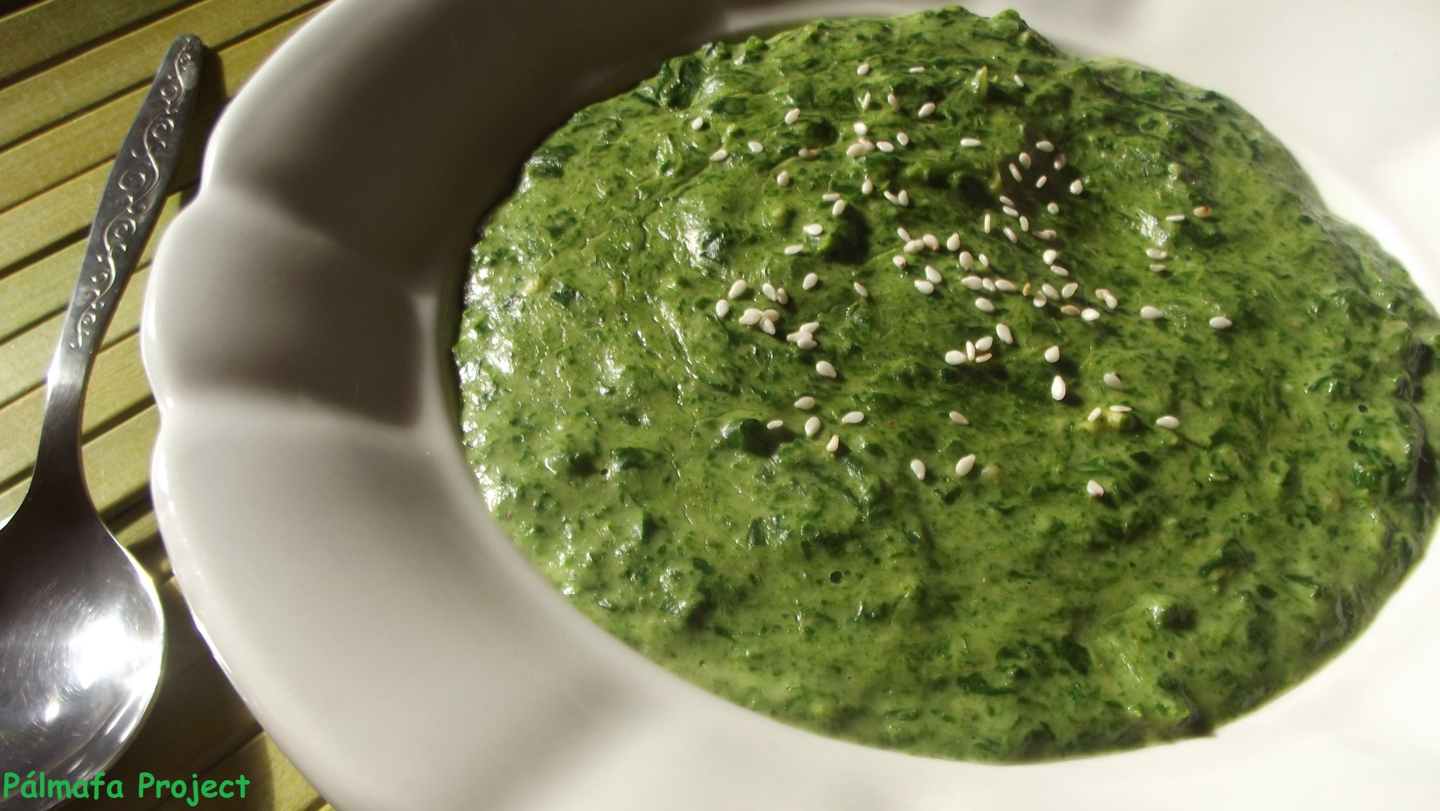 A kókuszzsírt felolvasztottam egy serpenyőben, majd rádobtam a spenótot, ráreszeltem a fokhagymát, sóztam, rászórtam a többi fűszert is és megvártam, míg a spenót összeesik és megpuhul. Turmixgépbe tettem, megszórtam a zabliszttel, felöntöttem a kókusztejjel és összeturmixoltam, majd visszatettem a gázra és ismét felforraltam, megvártam míg besűrűsödik, aztán elzártam a gázt alatta. Tálaláskor megszórtam szezámmaggal.