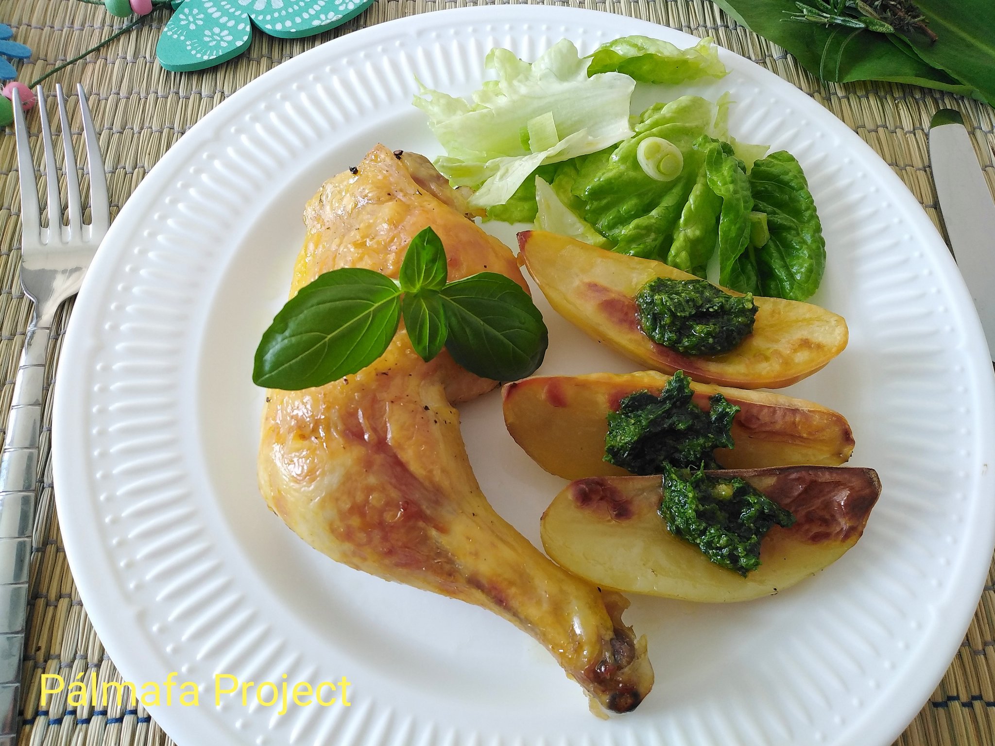 Amúgy ez akár ünnepi fogás is lehet húsvétra, hiszen könnyű ebből nagy adagot készíteni, és általában mindenki szereti a sült csirkét és krumplit, meló nincs vele, tepsire rá és sütőbe betol, ennyi. A pesto 5 perc és a saláta sem több nagyon, ráadásul előbbiből lehet többet készíteni, hűtőben eláll, tésztára is isteni, vagy pirítósra reggel, mondjuk a főtt tojás mellé.