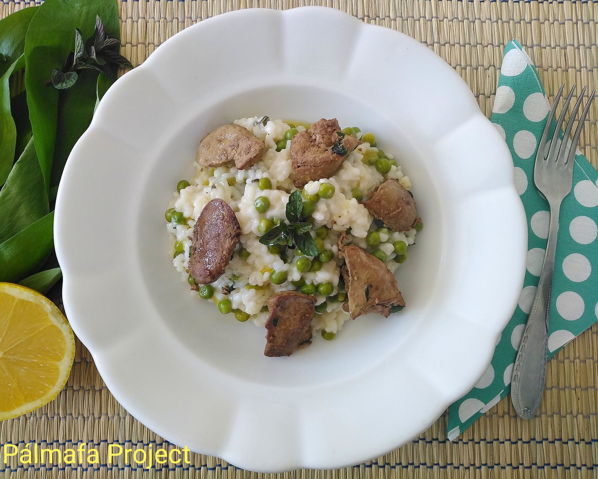 Mivel az én zöldborsóm már előző nap elkészült, akkor adtam a rizottóhoz, mikor a rizs már félig átpuhult, és tovább folytattam az alaplé adagolását, míg a rizs kellemesen roppanóssá vált és a rizottó még krémes állagú volt. Ekkor adtam hozzá a sajtkrémet, a többi friss mentát és a citromlevet is. Frissen az igazi, a máj és a rizottó is!