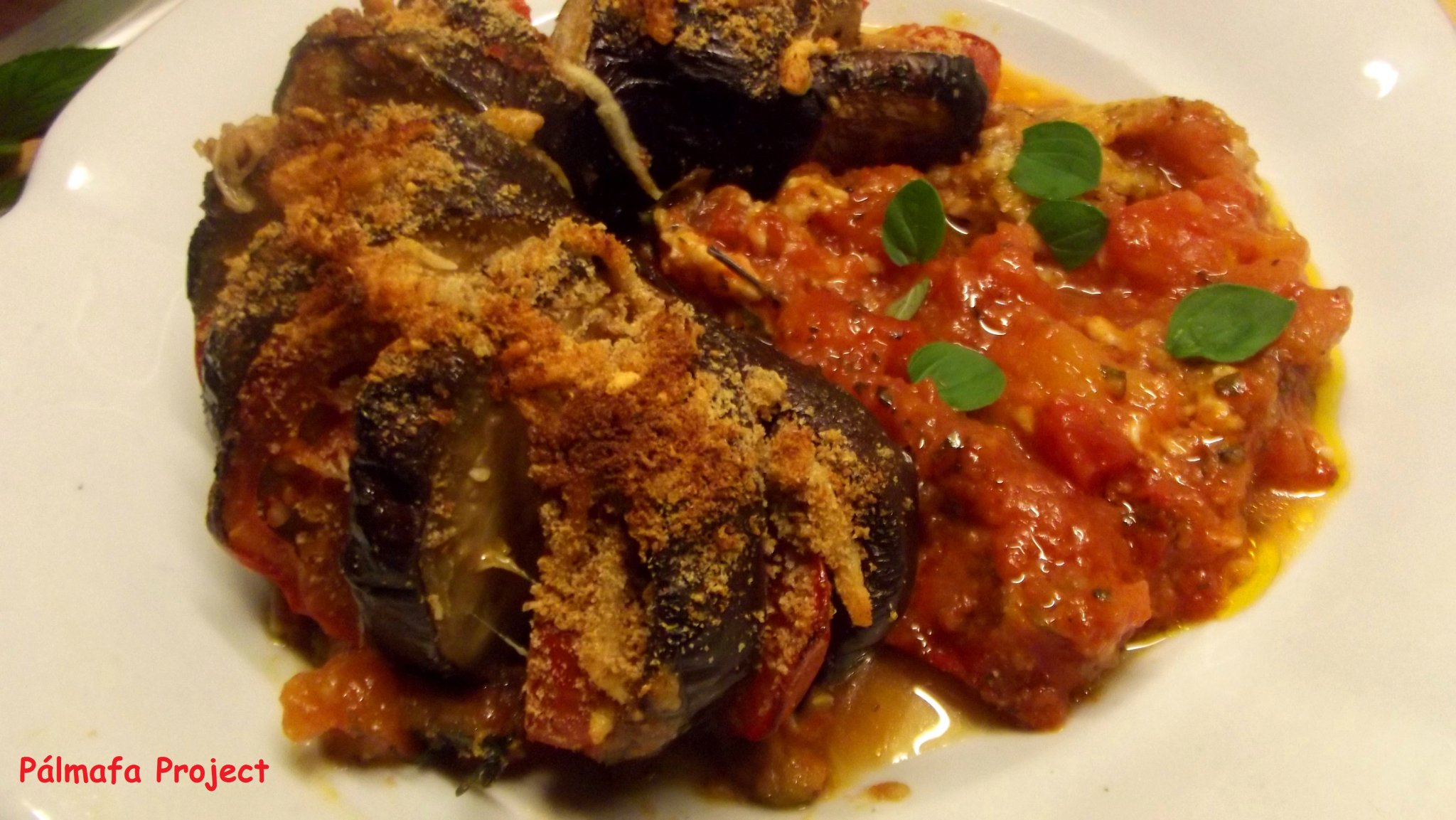 A besózott padlizsánról egy papírtörlővel felitattam a nedvességet, megtöltöttem a mozzarellával és a paradicsomszeletekkel, majd belehelyeztem ezt is a sütőtálba, picit még sóztam, borsoztam a tetejét és alufóliával lefedve a sütőbe toltam 45-50 percre. Aztán kivettem, levettem róla az alufóliát megszórtam a padlizsán tetejét a sajtos zsemlemorzsával, ekkor szórtam meg a felaprított friss oregánóval és mentával, majd még negyed órára visszatoltam a sütőbe, míg a sajt megolvad és a morzsa rápirul.