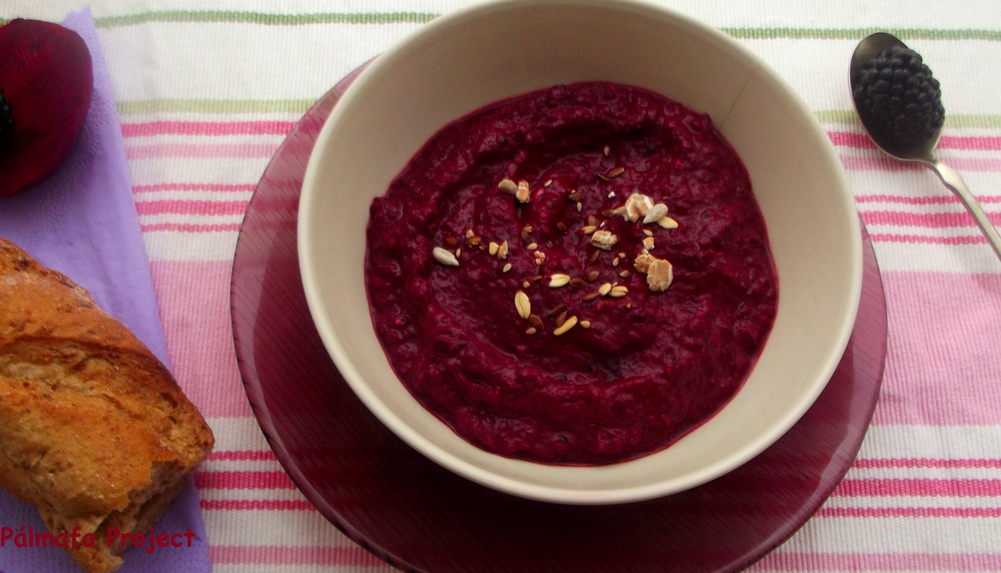 A legfinomabb reggeli lett belőle, kifilire kenve vaj helyett, már már lekvárszerű, hiszen édeskés, de morzsoltam bele maradék fetasajtot is, ami ugyan sós, de ezáltal még jobban kiemeli az ízeket. Bár az is biztos, hogy a feta nélkül is érdemes kipróbálni. Az meg még biztosabb, hogy ebből palacsinta töltelék is lesz hamarosan, mondjuk a hajdinalisztes verzióhoz pont passzolna azt gondolom. Szeder helyett málna vagy áfonya is társulhat a cékla mellé, mindegyik hozzávalóval hatalmas szívességet teszünk a szervezetünknek, az ízlelőbimbóinkról nem is beszélve.