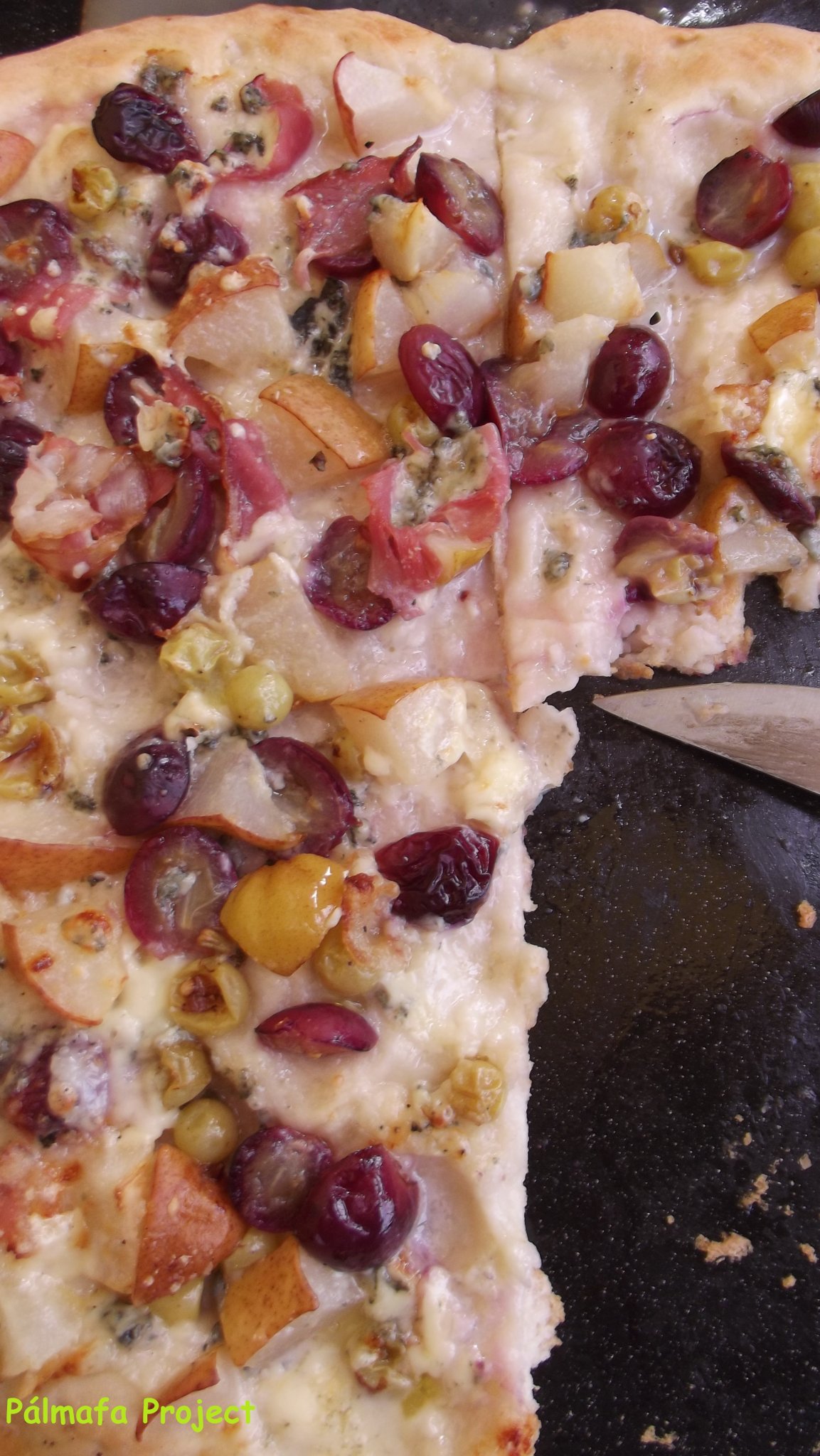 Jöjjön egy másik ízbomba, és kivételesen kalóriabomba is, de bűnözni néha ér, gyümölcsös pizzával pláne. Szőlő, körte, büdös sajt, mindez Jamie pizzatésztáján.
