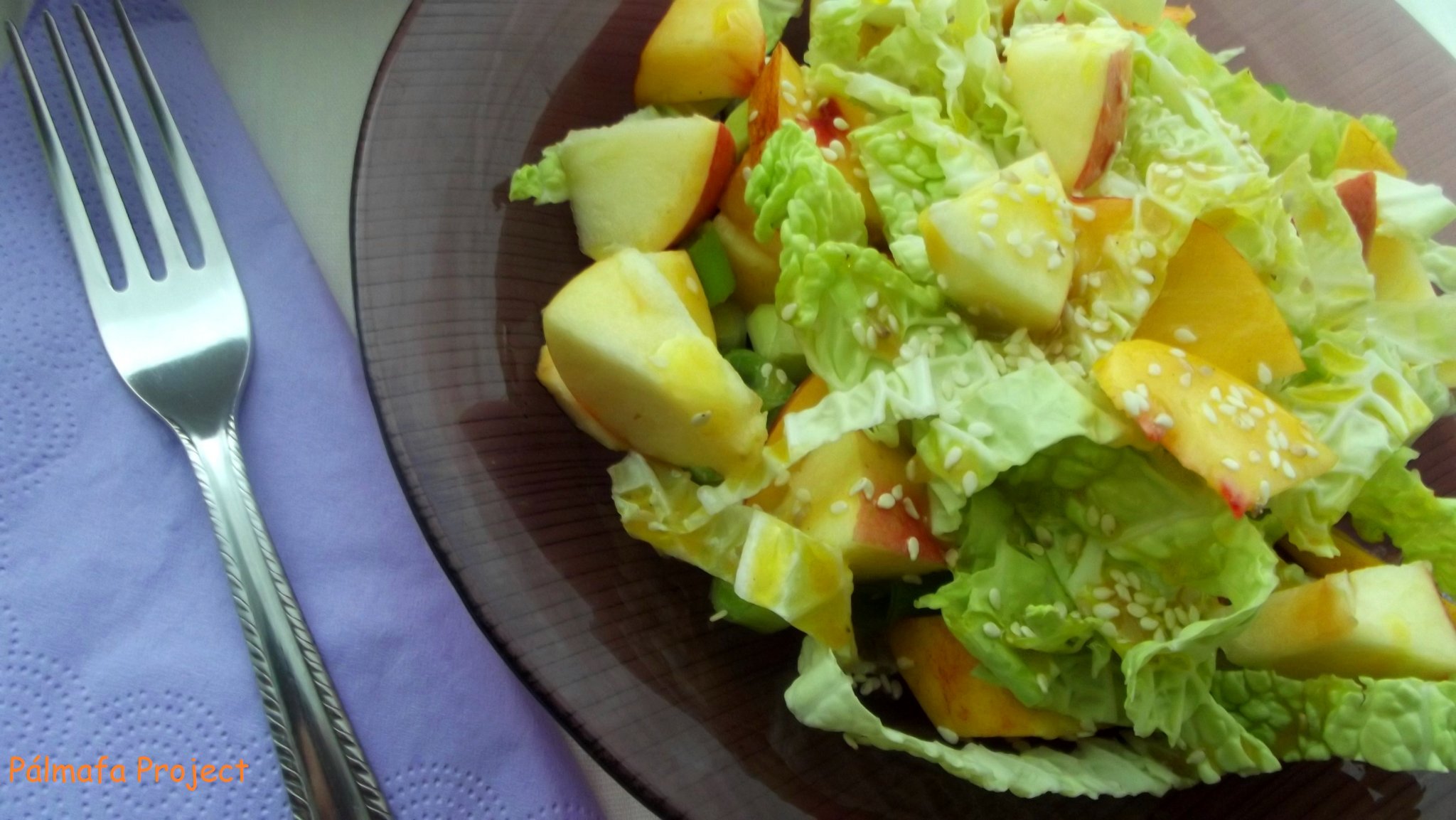 A káposztát leveleire szedtem, alaposan megmostam és vékony csíkokra vágtam. A nektarint és almát felkockáztam, a hagymát vékonyan felkarikáztam és mindent egy tálba szórtam. Az öntethez simára kevertem az olívaolajat, mustárt, mézet, fehérborecetet, sóztam, borsoztam és hozzáöntöttem a többi hozzávalóhoz, majd jól összeforgattam, a tetejére pedig rászórtam a szezámmagot és már tálalható is.