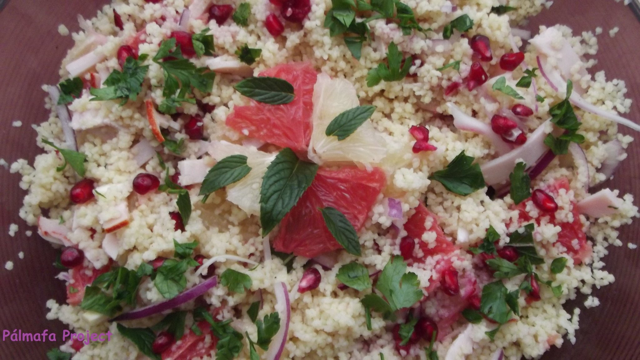 A kuszkuszt leöntöttem a felforralt vízzel, lefedtem és állni hagytam. Addig felszeleteltem a többi hozzávalót, a grapefruitot félbevágtam és körben levágtam róla a héját, a héjdarabokban maradt pici gyümölcshúsból is kicsavartam a levet, ez pont elég lesz az öntethez az olívaolaj mellé. Mikor a kuszkusz megpuhult, mindent összekevertem, sóztam, borsoztam, csorgattam rá olajat és a grapefrútok levét, a tetejét pedig megszórtam mentával és petrezselyemmel. Jót tesz neki ha egy fél órát áll tálalás előtt.