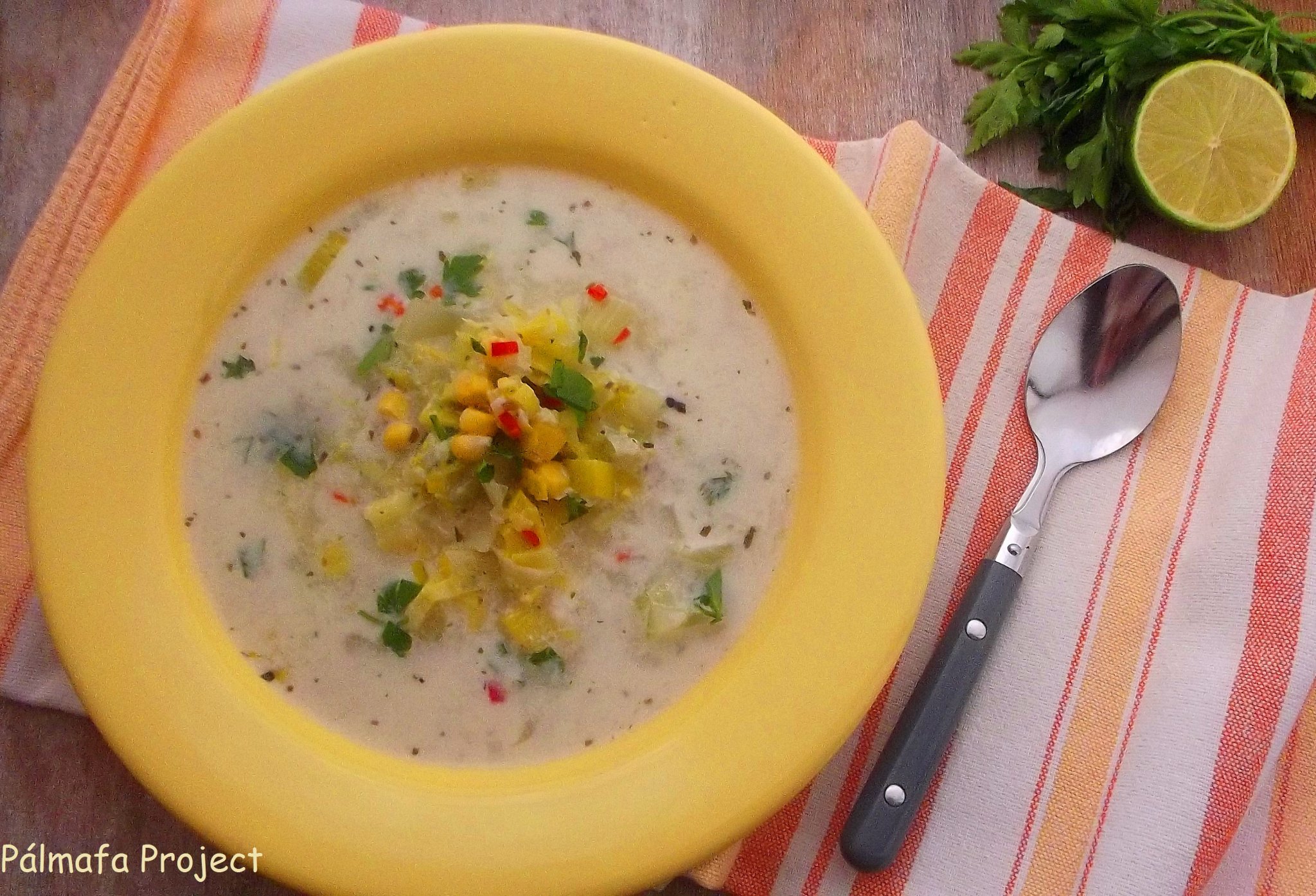 A kókuszolajon megpároltam a felaprított vöröshagymát és fokhagymát, rászórtam a vékonyan felkarikázott póréhagymát, sóztam, borsoztam, megszórtam tárkonnyal és felöntöttem kb. 1 liter vízzel és lefedve főztem, míg a hagyma majdnem teljesen átpuhult. Ekkor hozzáadtam a vékonyra szeletelt szárzellert is a kukoricával együtt, majd beleöntöttem a tejszínt.
