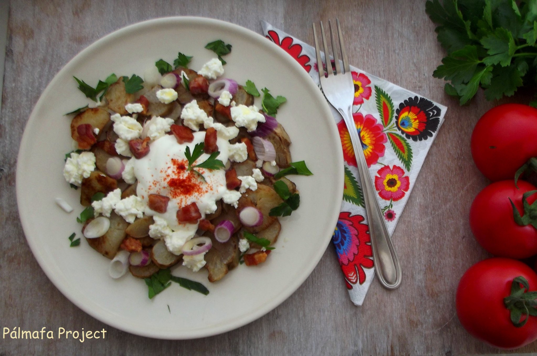 Tálaláskor megszórtam a túróval, a felkarikázott hagymával, őrölt paprikával és petrezselyemmel, végül tejfölt kanalaztam rá. Friss paradicsommal vagy más zöld salátával isteni!