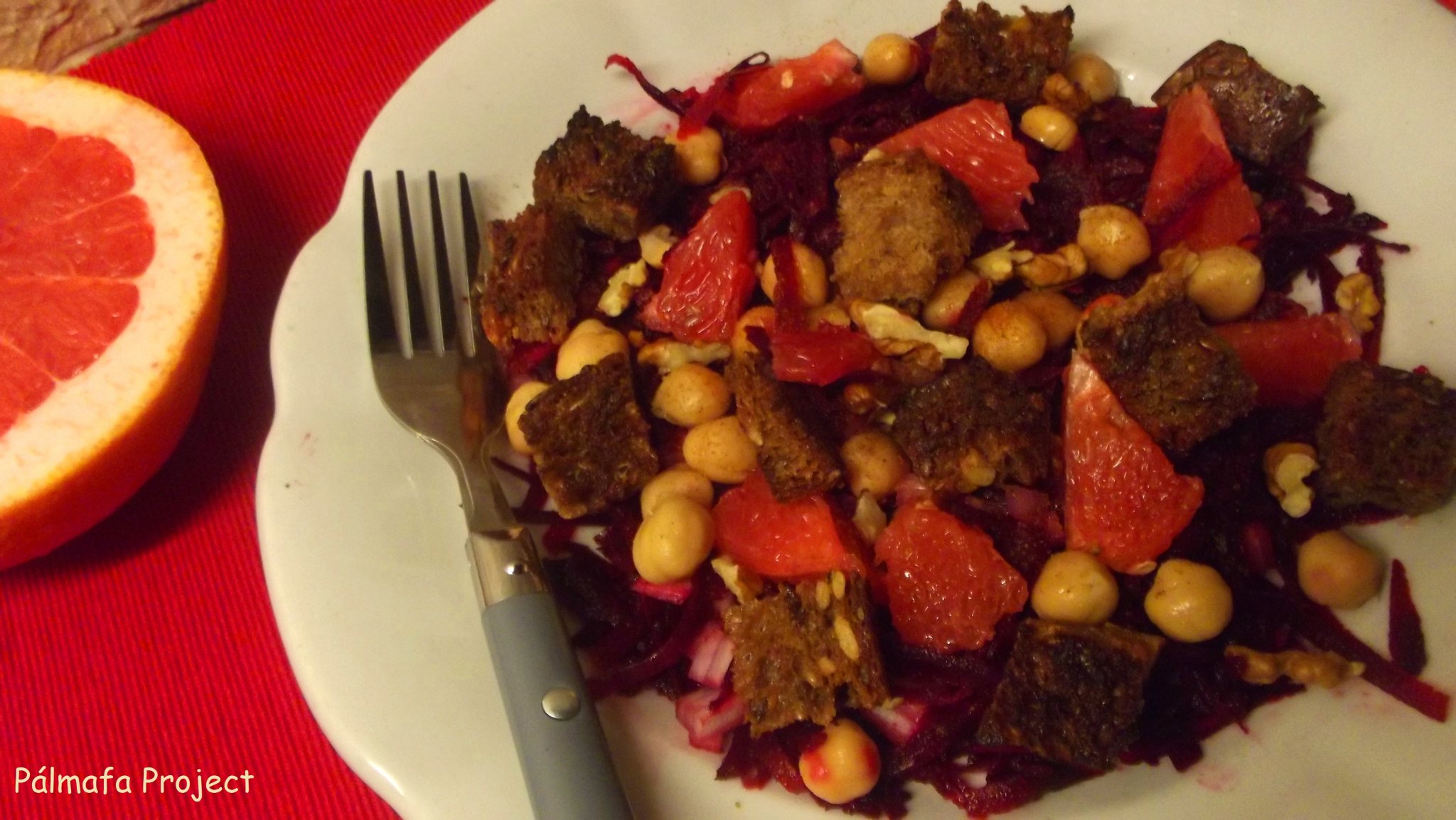 A lilahagymát apró kockákra vágtam, céklát egy tálba lereszeltem, a grapefruitot félbevágtam, bekockáztam a húsát, majd kifordítottam, így kiestek a kis cikkek belőle, a benne maradt húsból pedig kifacsartam a levet, majd beleszórtam a lecsöpögtetett és leöblített csicseriborsót.