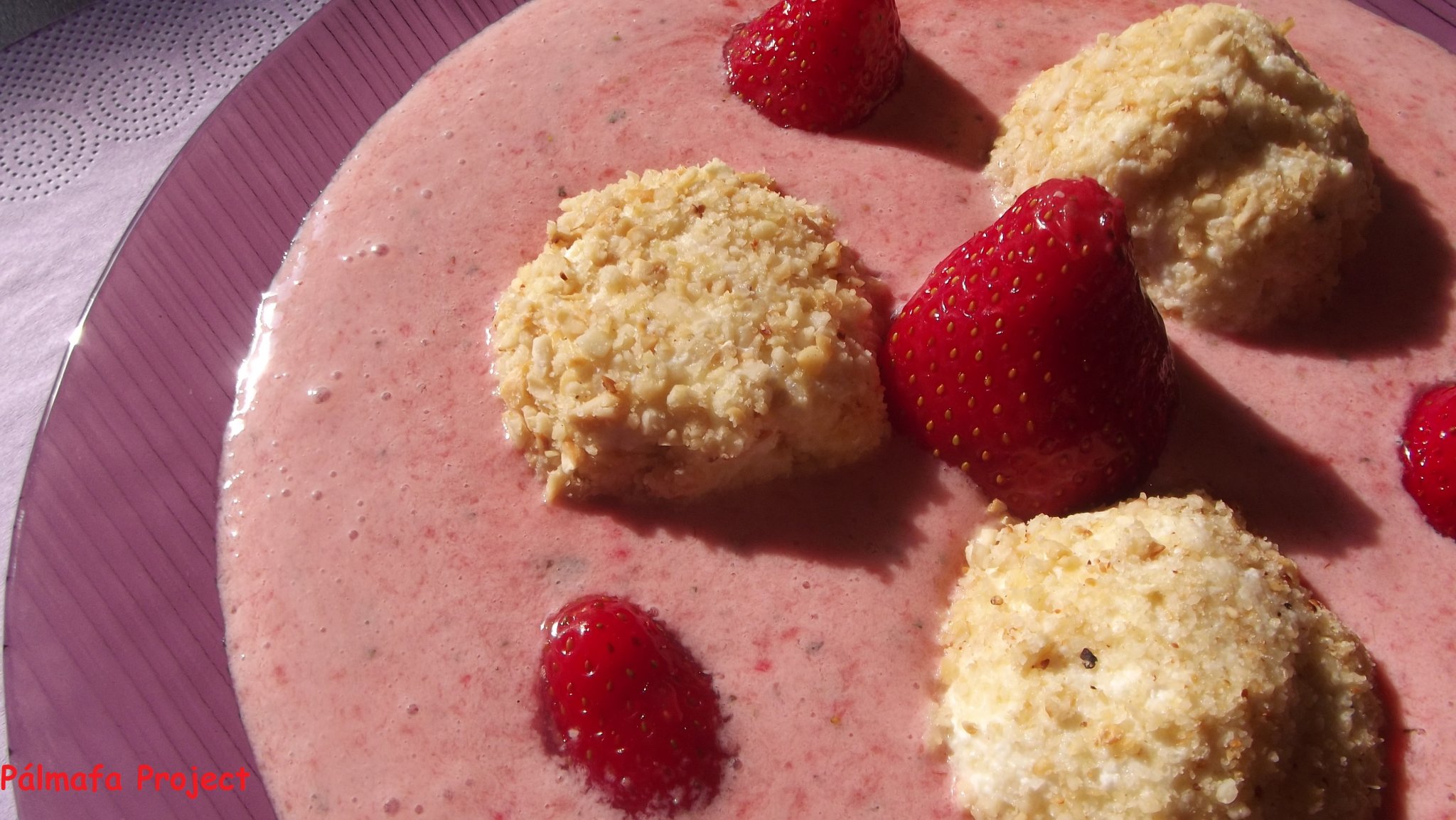 A köleses túróból gombócokat formáztam és meghempergettem a darált kesudióban, majd tálalás előtt megkoronáztam eperszósszal illetve másnap a szintén nyersen összeturmixolt hideg eperlevesbe kerültek.
