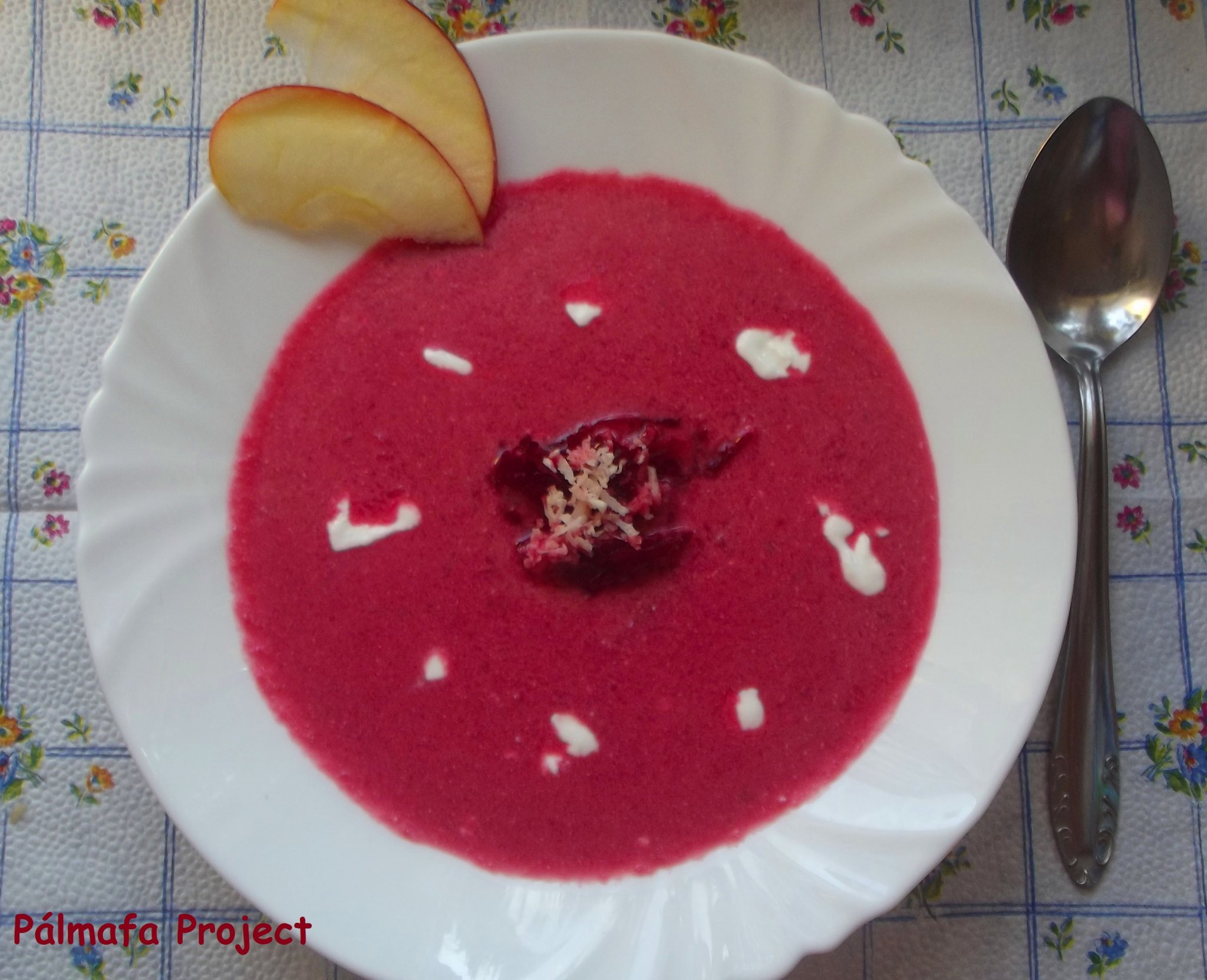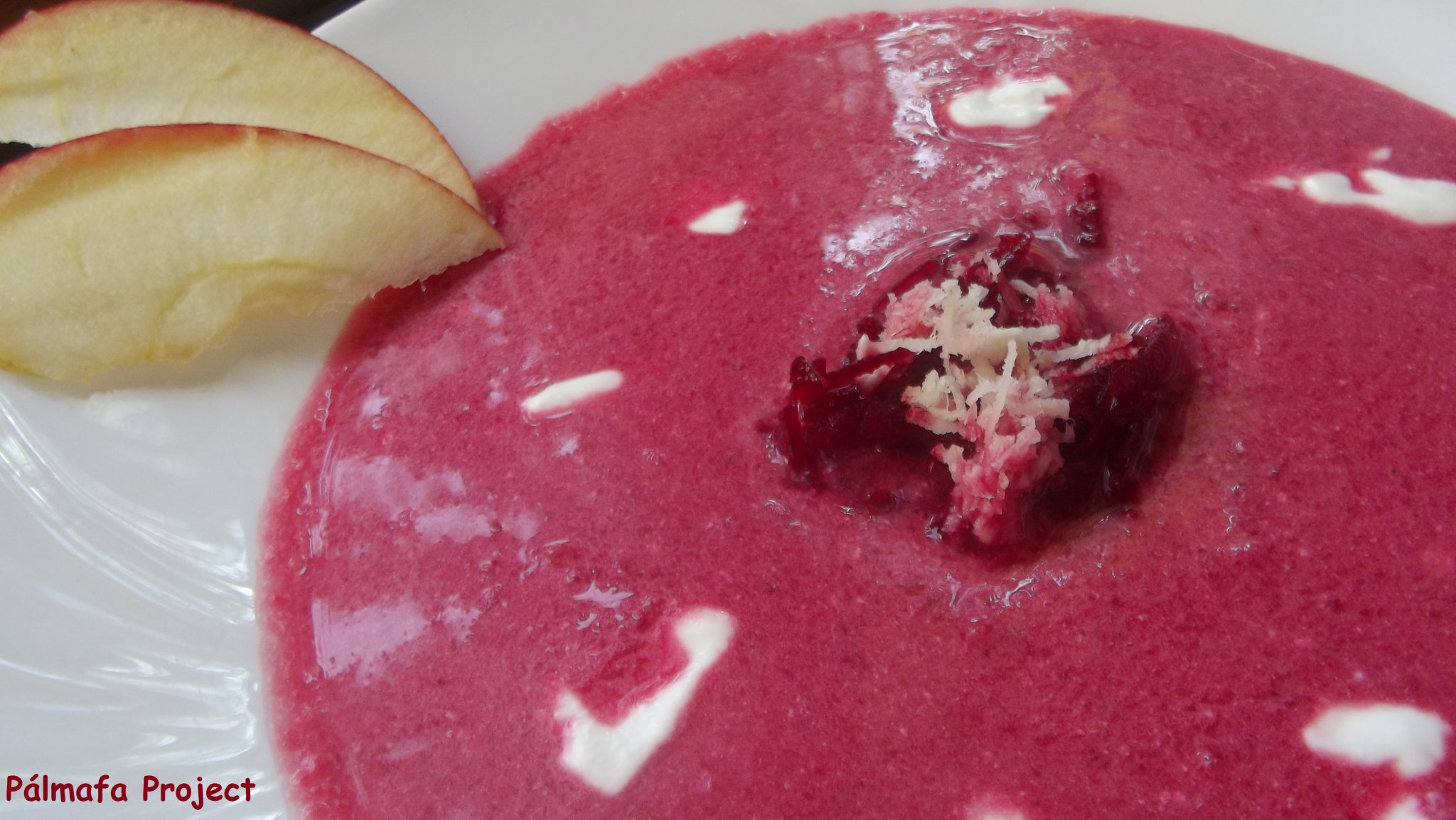 A hagymát felkockáztam és az olívaolajon üvegesre pároltam, ezután hozzáadtam a reszelt céklát majd felöntöttem annyi vízzel, hogy ellepje. Sóztam borsoztam, megvártam míg a cékla megpuhult. Eközben lereszeltem az almát, a citrom héját, a levét pedig kifacsartam. Ha cékla megpuhult ezeket mind a leveshez adtam és éppen összekevertem és hagytam, hogy ismét forrni kezdjen mikor már el is zártam a gázt, hogy ne főzzem agyon az almát. Egy botmixerrel pürésítettem a levest, aztán hozzáöntöttem a joghurtot, simára kevertem és kihűtöttem, majd frissen reszelt céklával és tormával két tányárral eltűntettem.